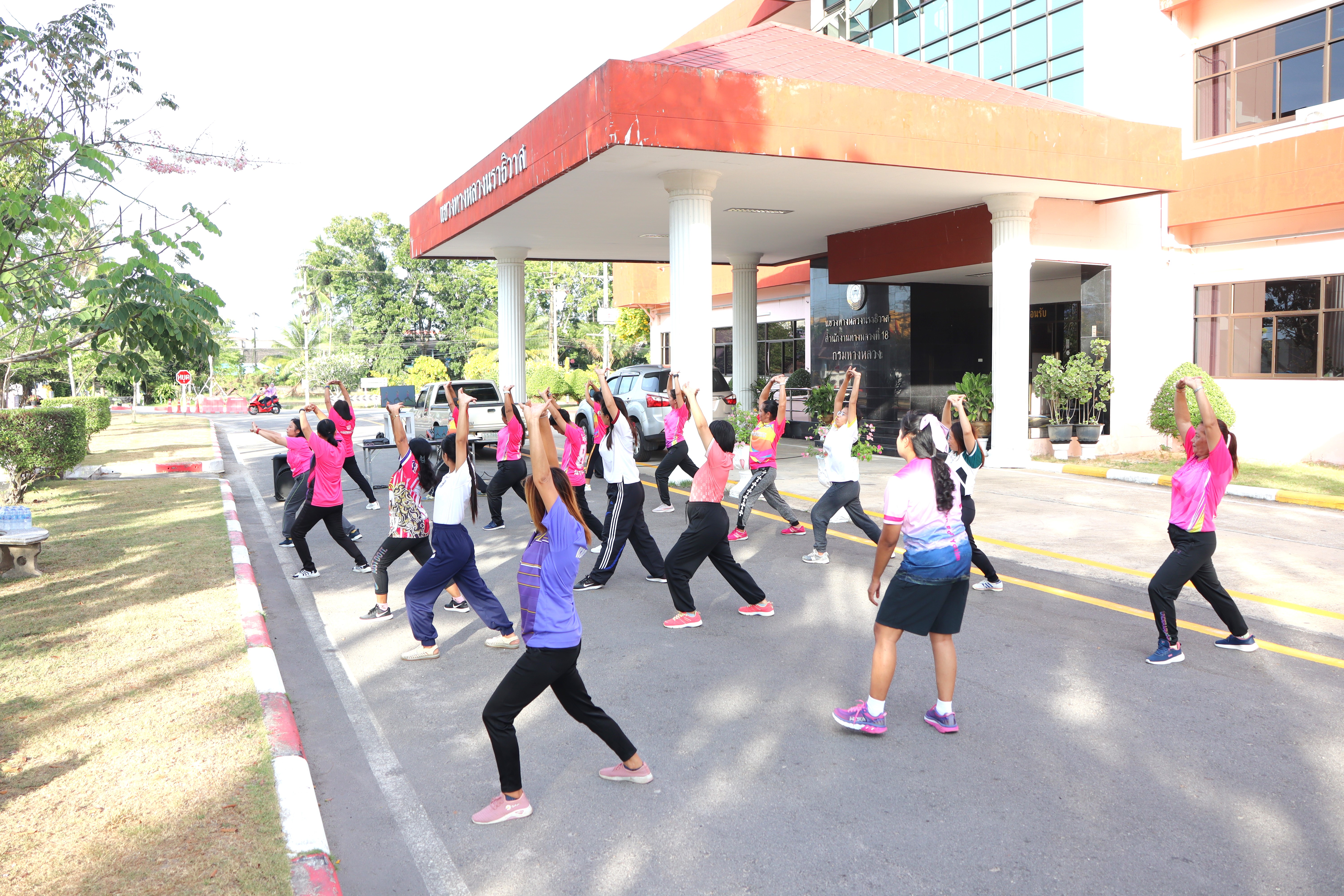 นายจอมปวีร์ จันทร์หิรัญ ผู้อำนวยการสำนักงานทางหลวงที่ 18 รักษาราชการแทน ผู้อำนวยการแขวงทางหลวงนราธิวาส มอบหมายให้นางอรัญญา เพ็ชรพูล รองผู้อำนวยการแขวงทางหลวงนราธิวาส ฝ่ายบริหาร นำข้าราชการ และเจ้าหน้าที่ในสังกัด ร่วมกิจกรรมการออกกำลังกายทุกวันพุธตามนโยบายขับเคลื่อนการส่งเสริมและพัฒนาการออกกำลังกาย และกีฬาเพื่อมวลชนให้เป็นวิถีชีวิต ณ บริเวณหน้าอาคารสำนักงานแขวงทางหลวงนราธิวาส เพื่อเป็นการเสริมสร้าง ให้บุคลากรมีสุขภาพพลานามัยที่ดี ทำให้สามารถปฏิบัติภารกิจหน้าที่ราชการได้อย่างมีประสิทธิภาพ