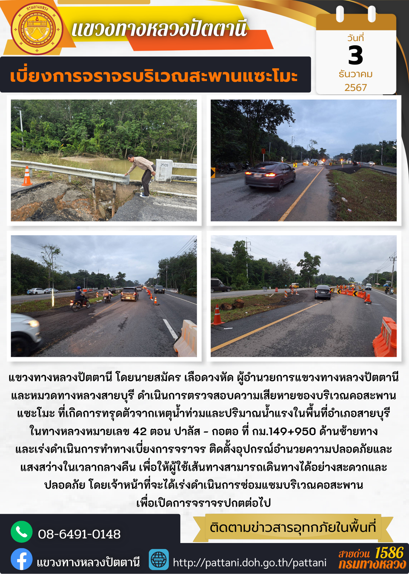 #ประชาสัมพันธ์ทางเบี่ยงการจราจร (ชั่วคราว) โครงการก่อสร้างสะพานจุดตัดทางหลวงหมายเลข 42 ตัดทางหลวงหมายเลข 410 (แยกตะลุโบะ) จ.ปัตตานี ระหว่าง วันที่ 7 เมษายน 2569 - 4 พฤษภาคม 2569