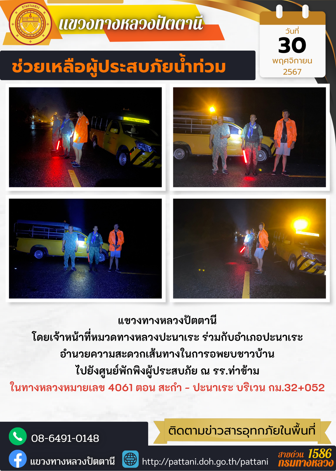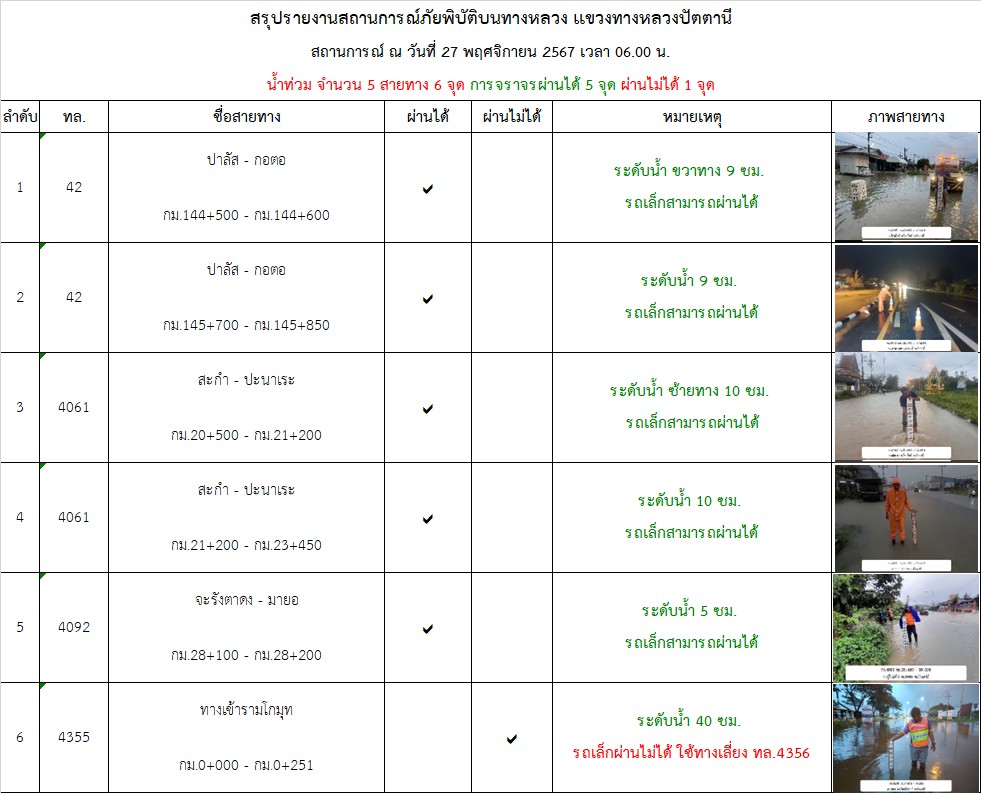 แขวงทางหลวงปัตตานี ขอรายงานสรุปสถานการณ์น้ำท่วมบนทางหลวงในพื้นที่