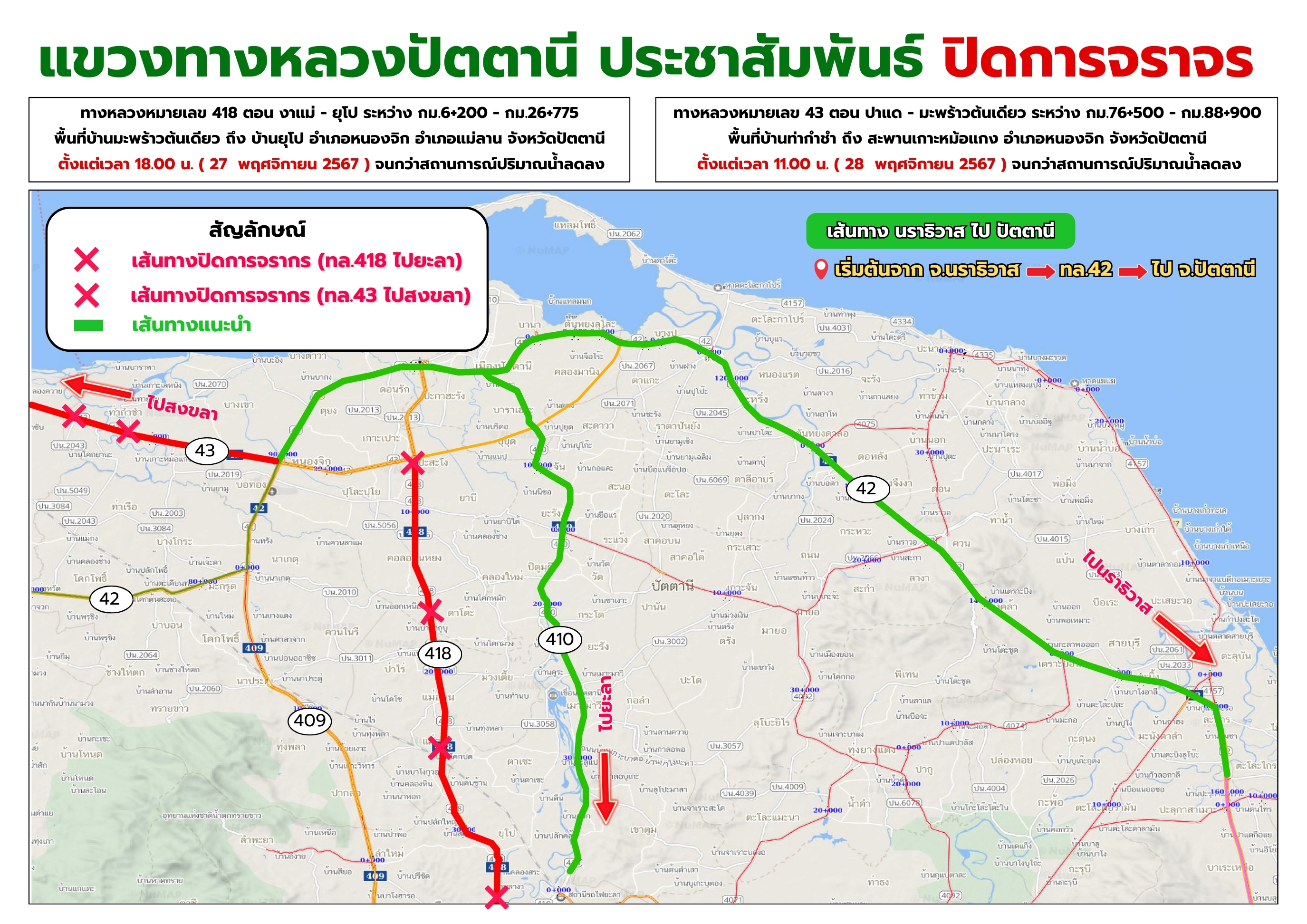 แขวงทางหลวงปัตตานี ขอปิดการจราจรทางหลวงหมายเลข 418 และทางหลวงหมายเลข 43