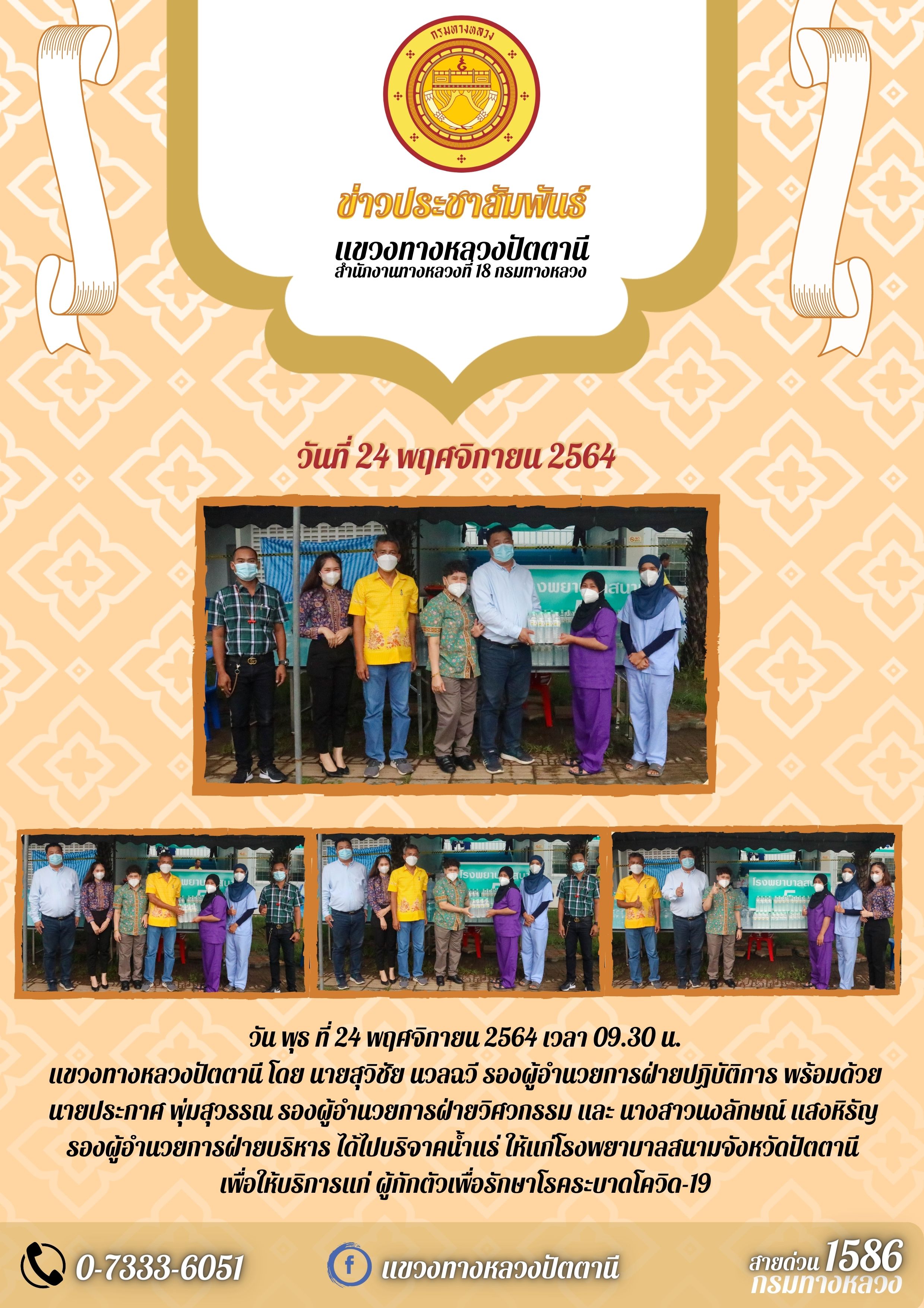 บริจาคน้ำแร่ ให้แก่โรงพยาบาลสนามจังหวัดปัตตานี เพื่อให้บริการแก่ ผู้กักตัวเพื่อรักษาโรคระบาดโควิด-19