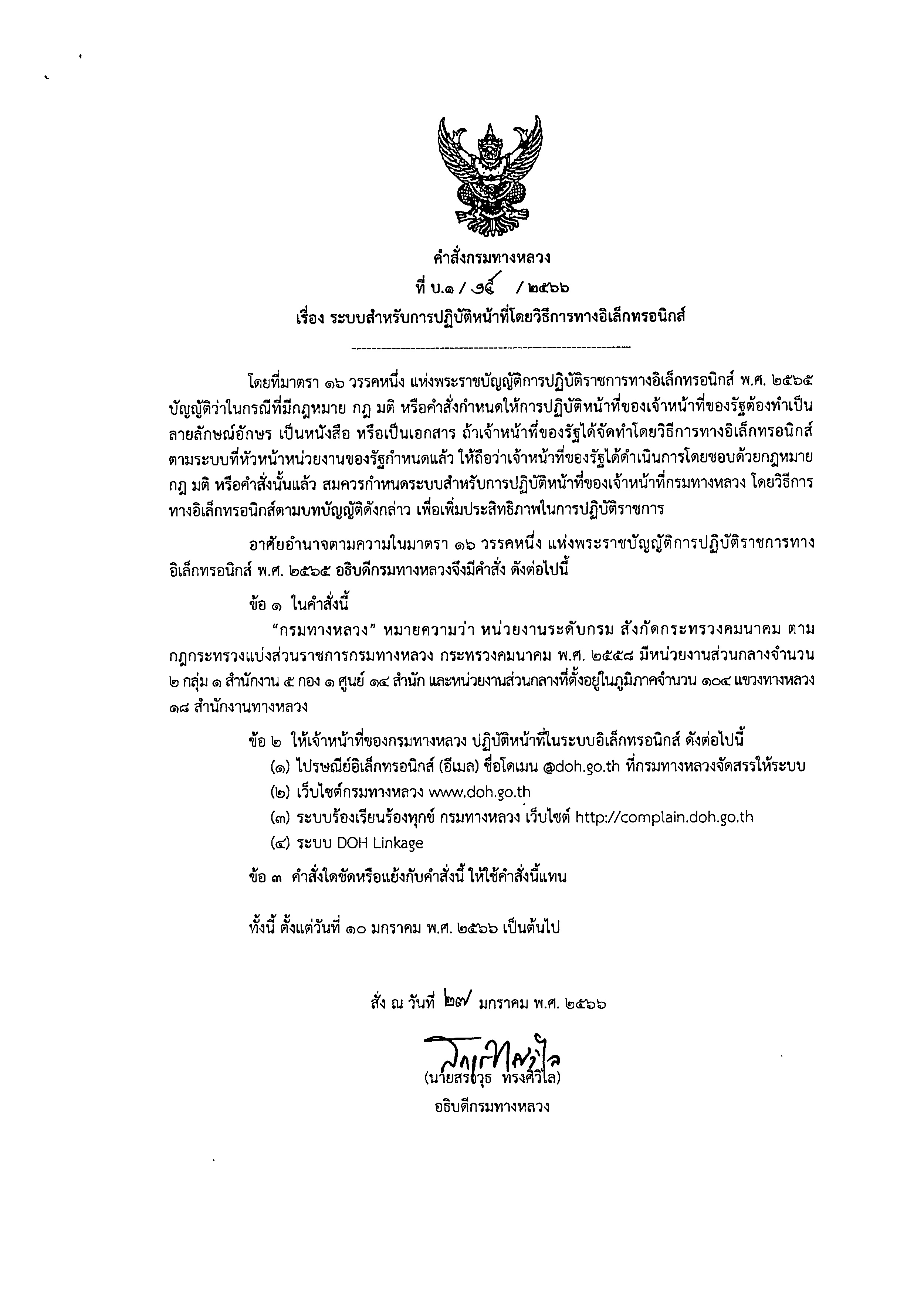 ประกาศกรมทางหลวง เรื่องช่องมางอิเล็กทรอนิกส์สำหรับติดต่อกรมทางหลวง พ.ศ. 2566 และคำสั่งกรมทางหลวง เรื่องสำหรับการปฏิบัติหน่าที่โดยวิธีอิเล็กทรอนิกส์