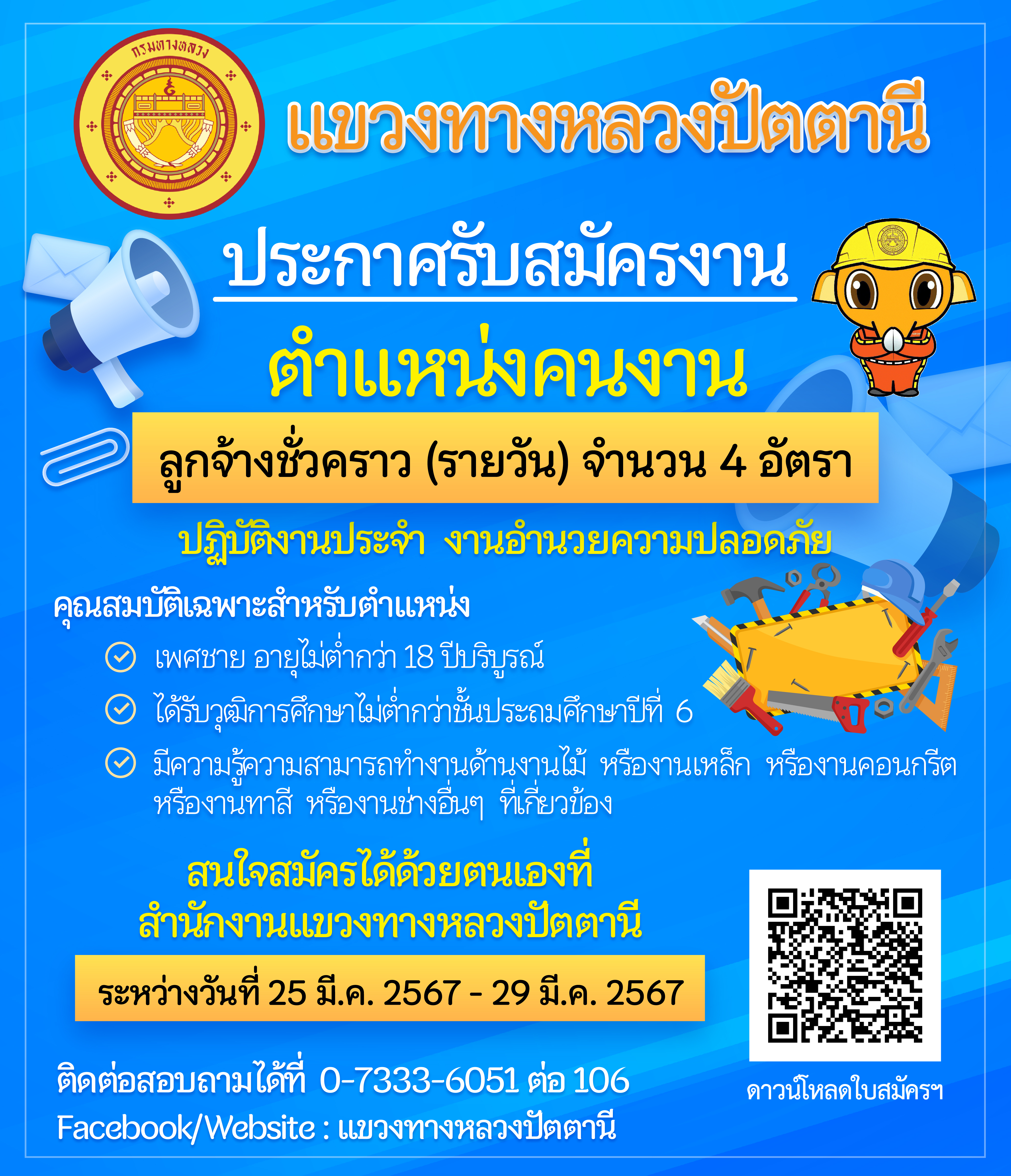 แขวงทางหลวงปัตตานี เปิดรับสมัครบุคคล ตำแหน่งคนงาน ลูกจ้างชั่วคราว (รายวัน) ปฏิบัติงานประจำ งานอำนวยความปลอดภัย จำนวน 4 อัตรา