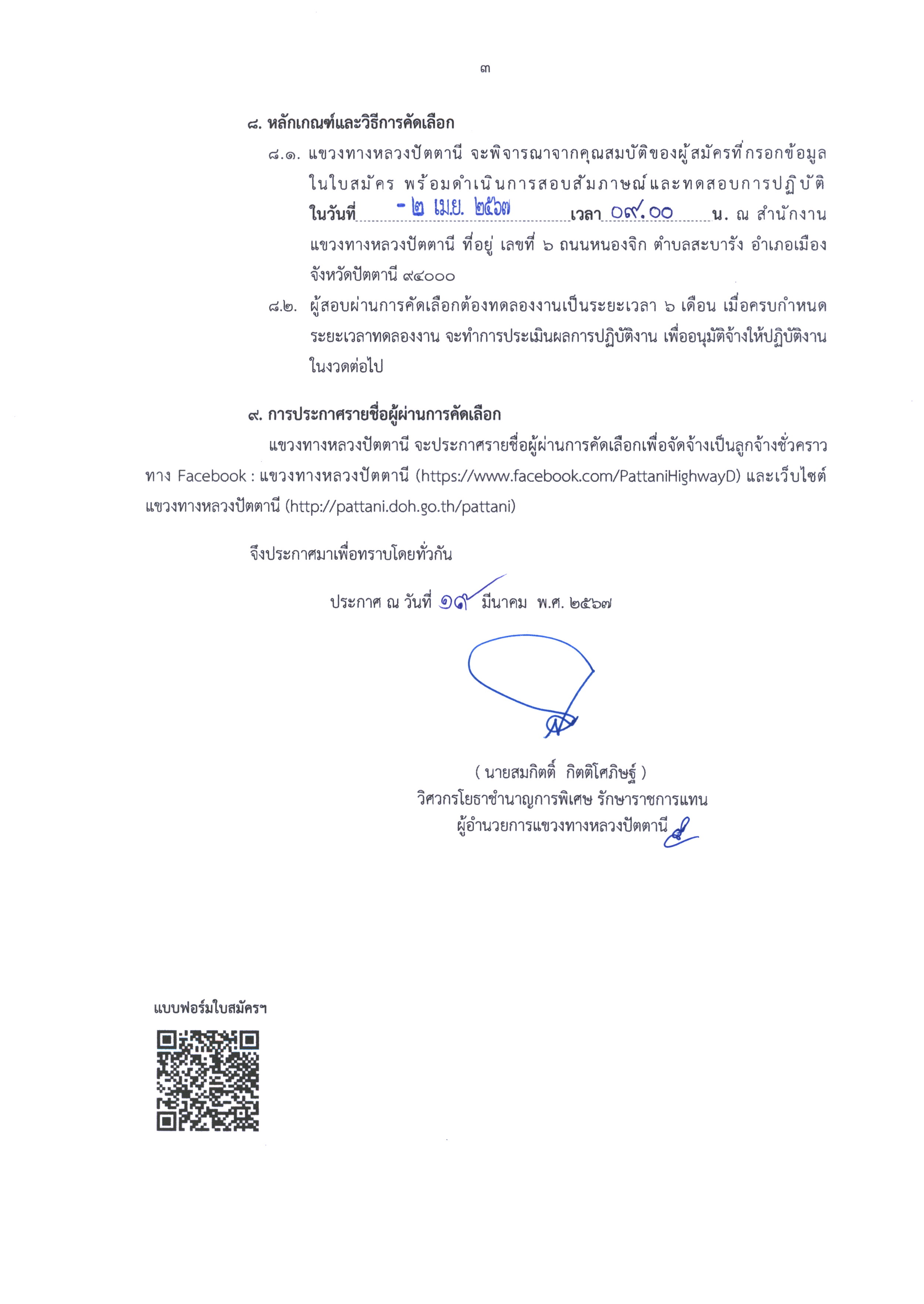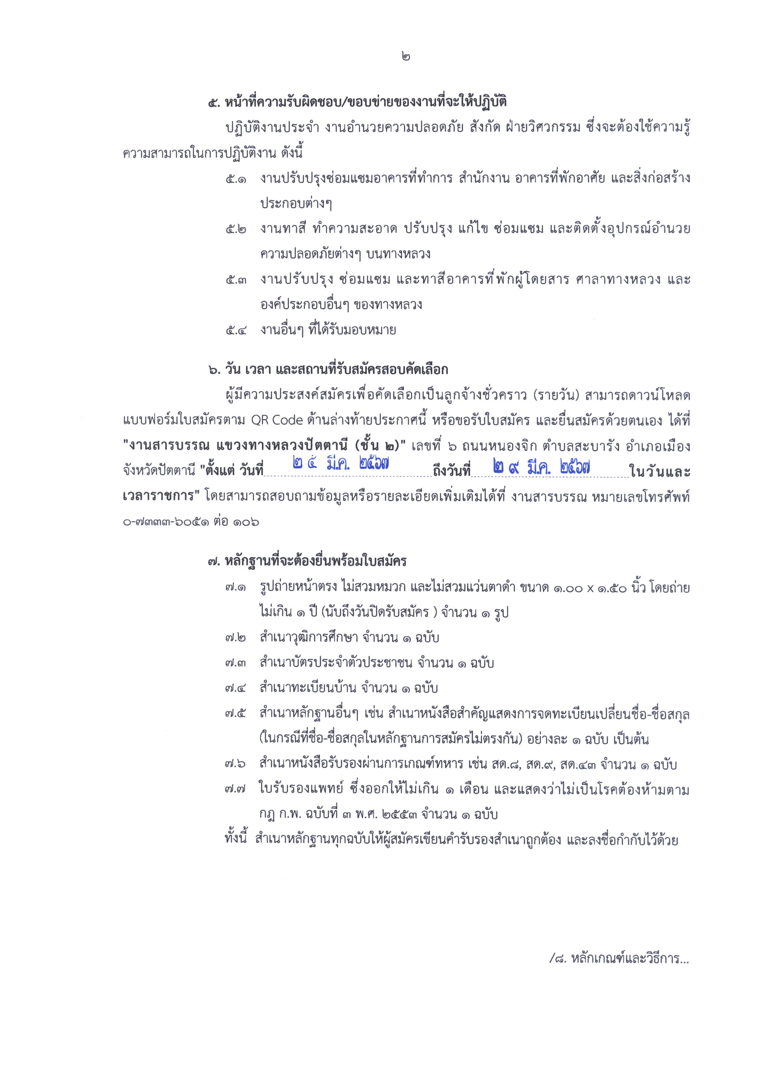 รับสมัครบุคคลเพื่อคัดเลือกเป็นลูกจ้างชั่วคราว (รายวัน) ตำเเหน่ง คนงาน สังกัด งานอำนวยความปลอดภัย เเขวงทางหลวงปัตตานี กรมทางหลวง