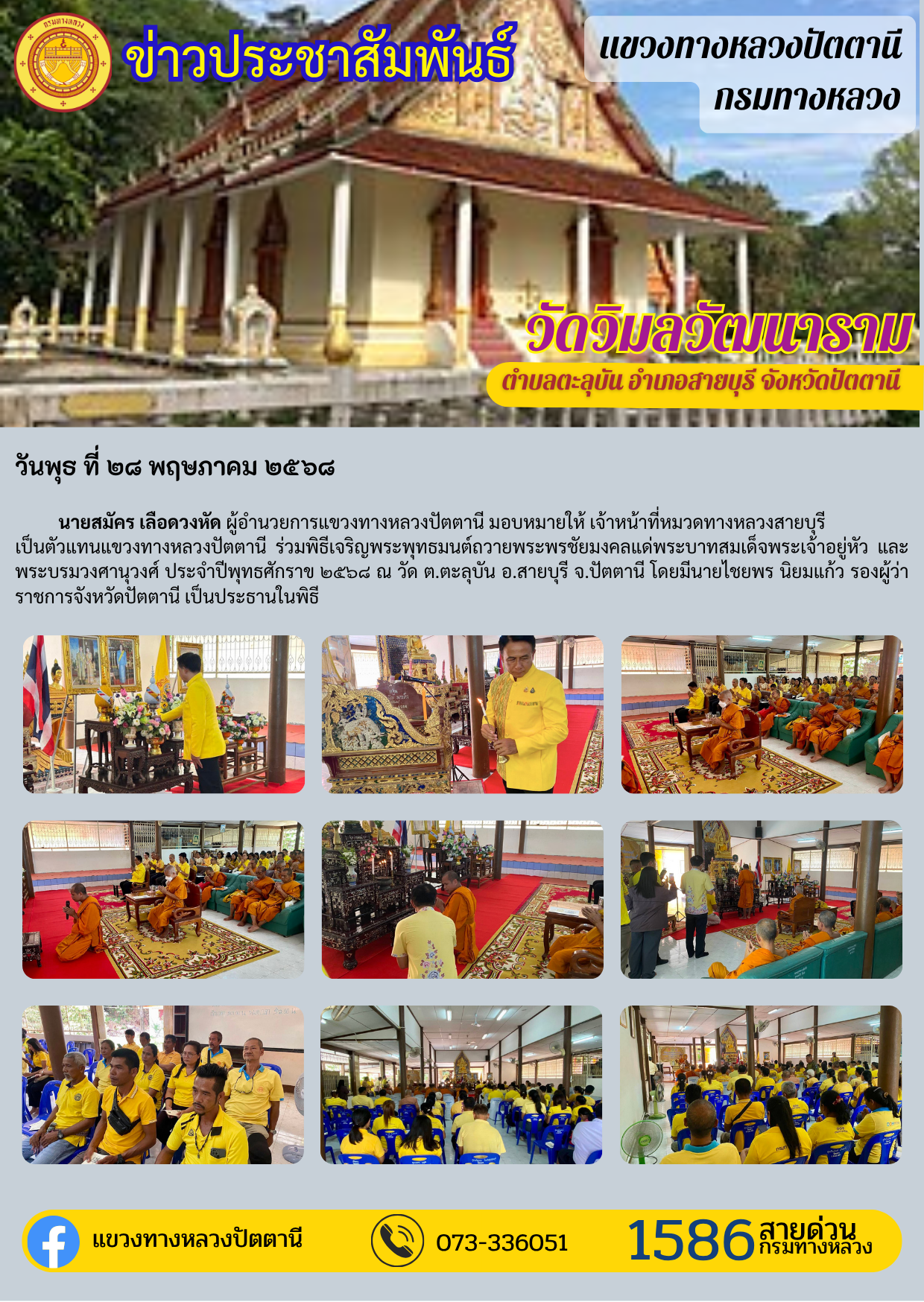 วันพุธ ที่ ๒๘ พฤษภาคม ๒๕๖๘ นายสมัคร เลือดวงหัด ผู้อำนวยการแขวงทางหลวงปัตตานี มอบหมายให้ เจ้าหน้าที่หมวดทางหลวงสายบุรี เป็นตัวแทนแขวงทางหลวงปัตตานี ร่วมพิธีเจริญพระพุทธมนต์ถวายพระพรชัยมงคลแด่พระบาทสมเด็จพระเจ้าอยู่หัว และพระบรมวงศานุวงศ์ ประจำปีพุทธศักราข ๒๕๖๘ ณ วัด ต.ตะลุบัน อ.สายบุรี จ.ปัตตานี โดยมีนายไชยพร นิยมแก้ว รองผู้ว่าราชการจังหวัดปัตตานี เป็นประธานในพิธี
