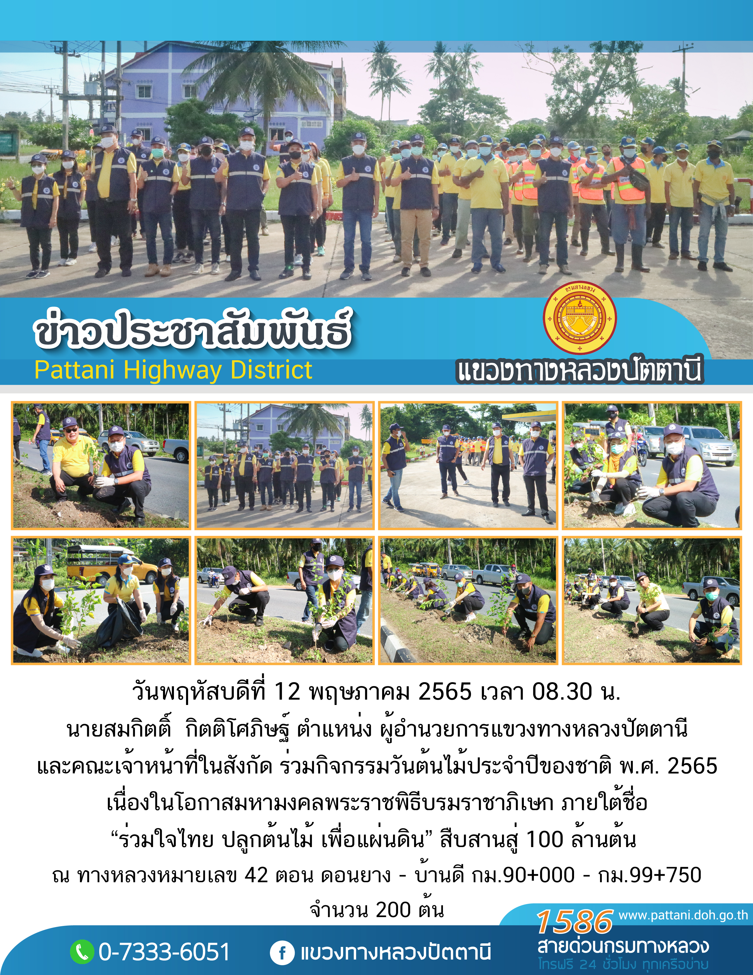 นายสมกิตติ์ กิตติโศภิษฐ์ ผู้อำนวยการแขวงทางหลวงปัตตานีและคณะเจ้าหน้าที่ในสังกัดร่วมกิจกรรมปลูกต้นไม้ประจำปีของชาติ พ.ศ. 2565 เนื่องในโอกาสมหามงคลพระราชพิธีบรมราชาภิเษก ภายใต้ชื่อ ร่วมใจ ปลูกต้นไม้ เพื่อแผ่นดิน สืบสาน 100 ล้านต้น ณ ทางหลวงหมายเลข 42 ตอน ดอนยาง-บ้านดี กม.90+000 - กม.99+750 จำนวน 200 ต้น