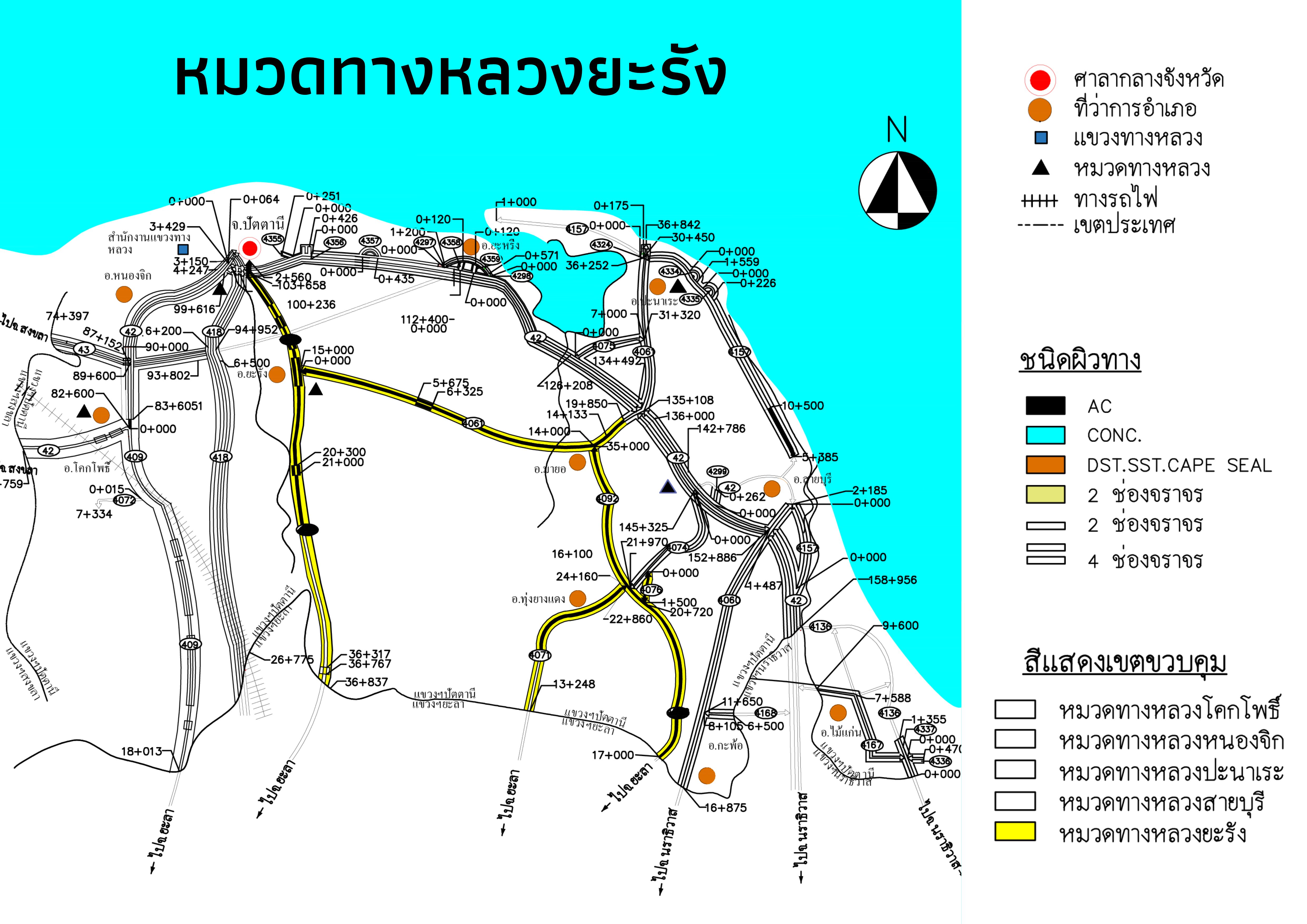 1. ทางหลวงหมายเลข 43 0303 ตอนปูยุดบารู - ตันหยงลิมอ (กม.98+427 - กม.105+152) ระยะทาง 6.725 กม.