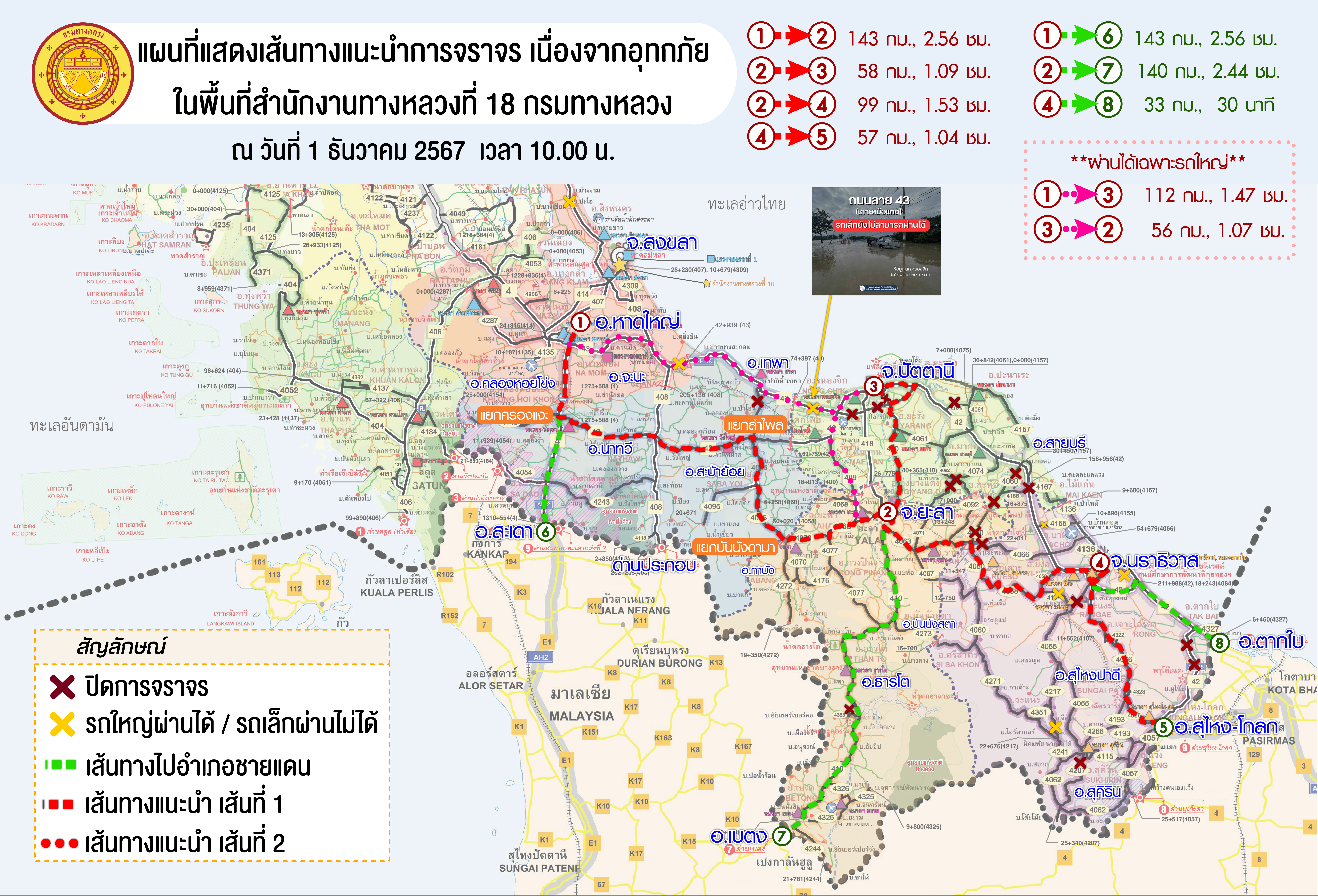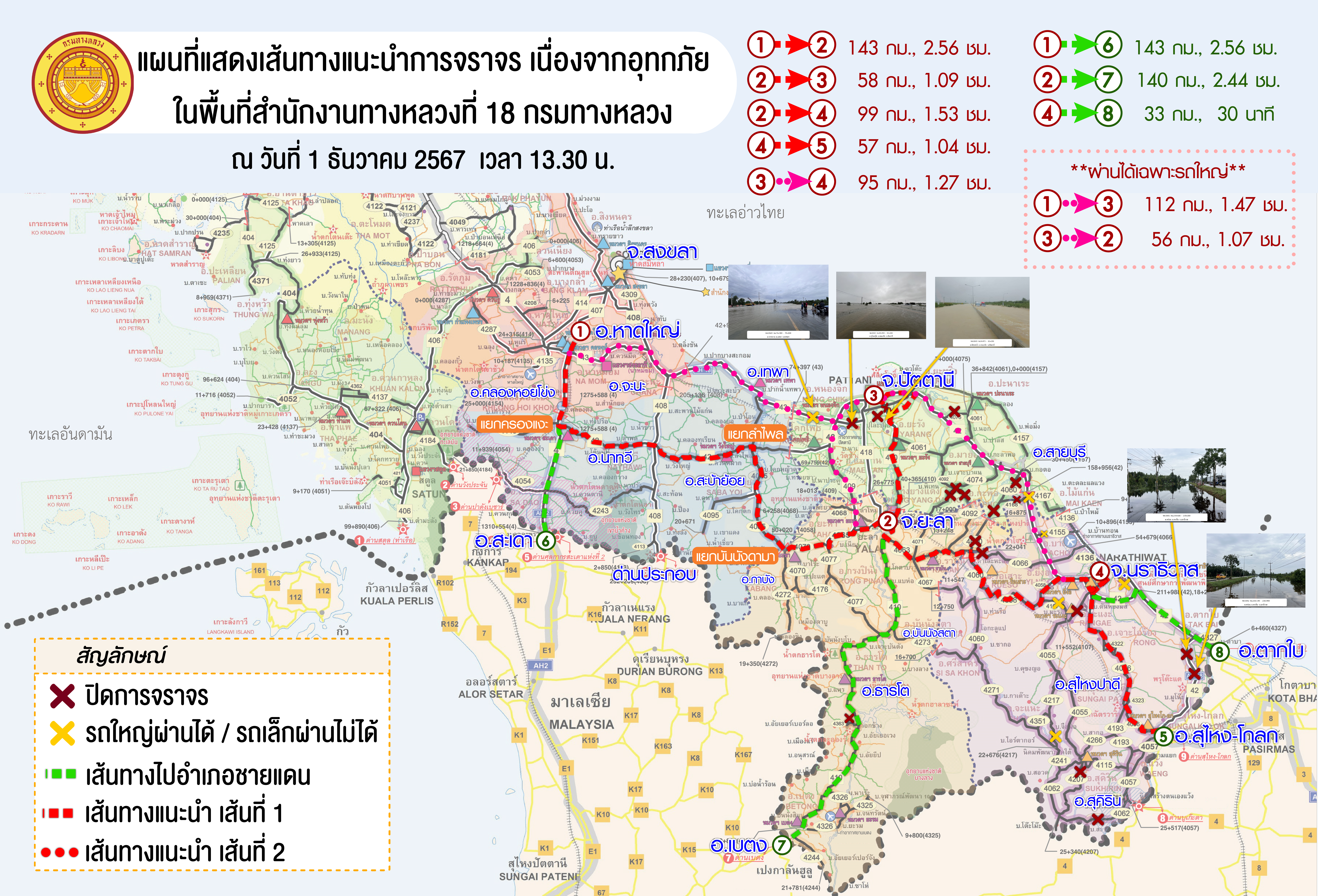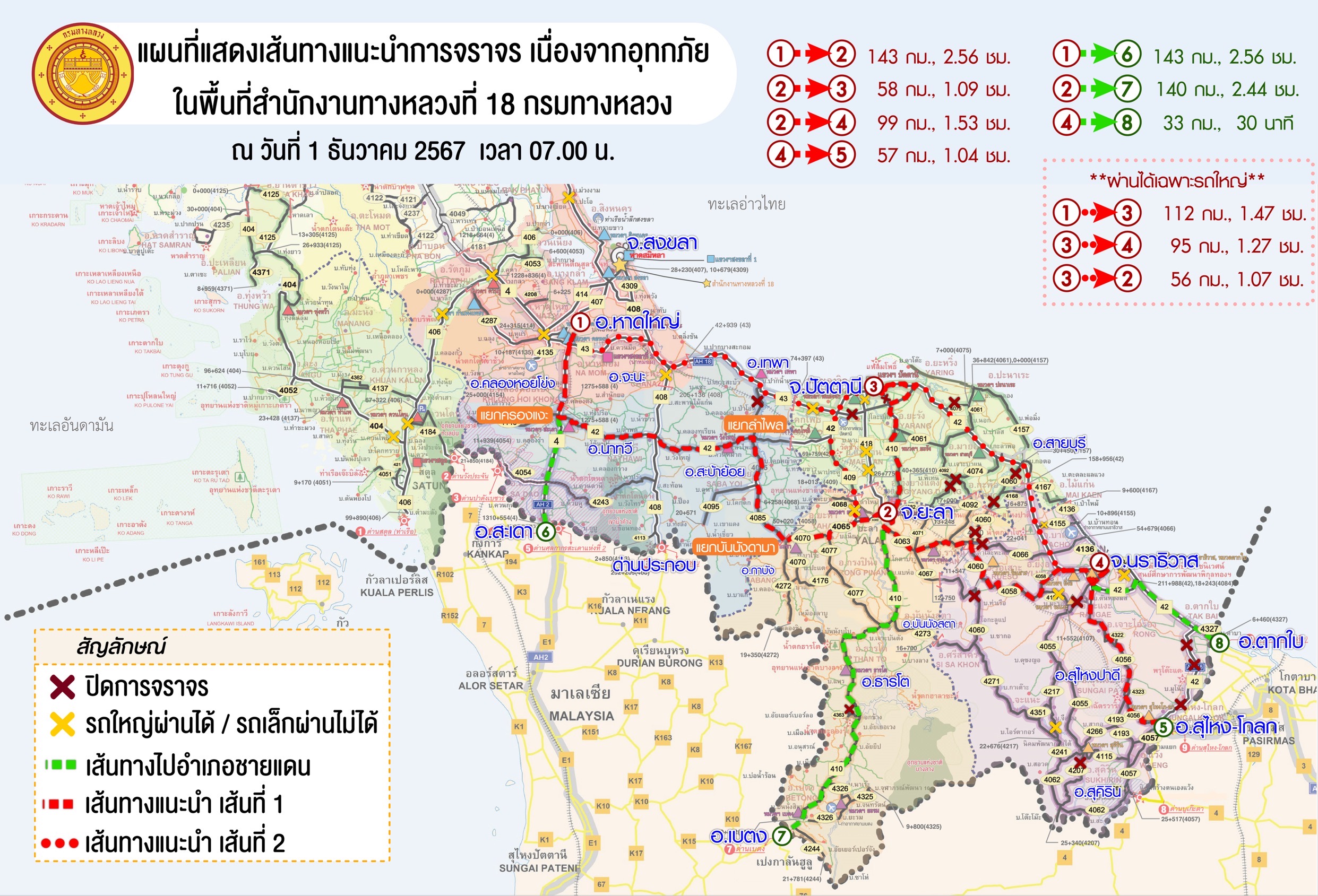 แผนที่แสดงเส้นทางแนะนำการจราจรเนื่องจากอุทกภัยในพื้นที่สำนักงานทางหลวงที่ 18 ข้อมูล ณ วันที่ 1 ธันวาคม 2567 เวลา 13.30 น.