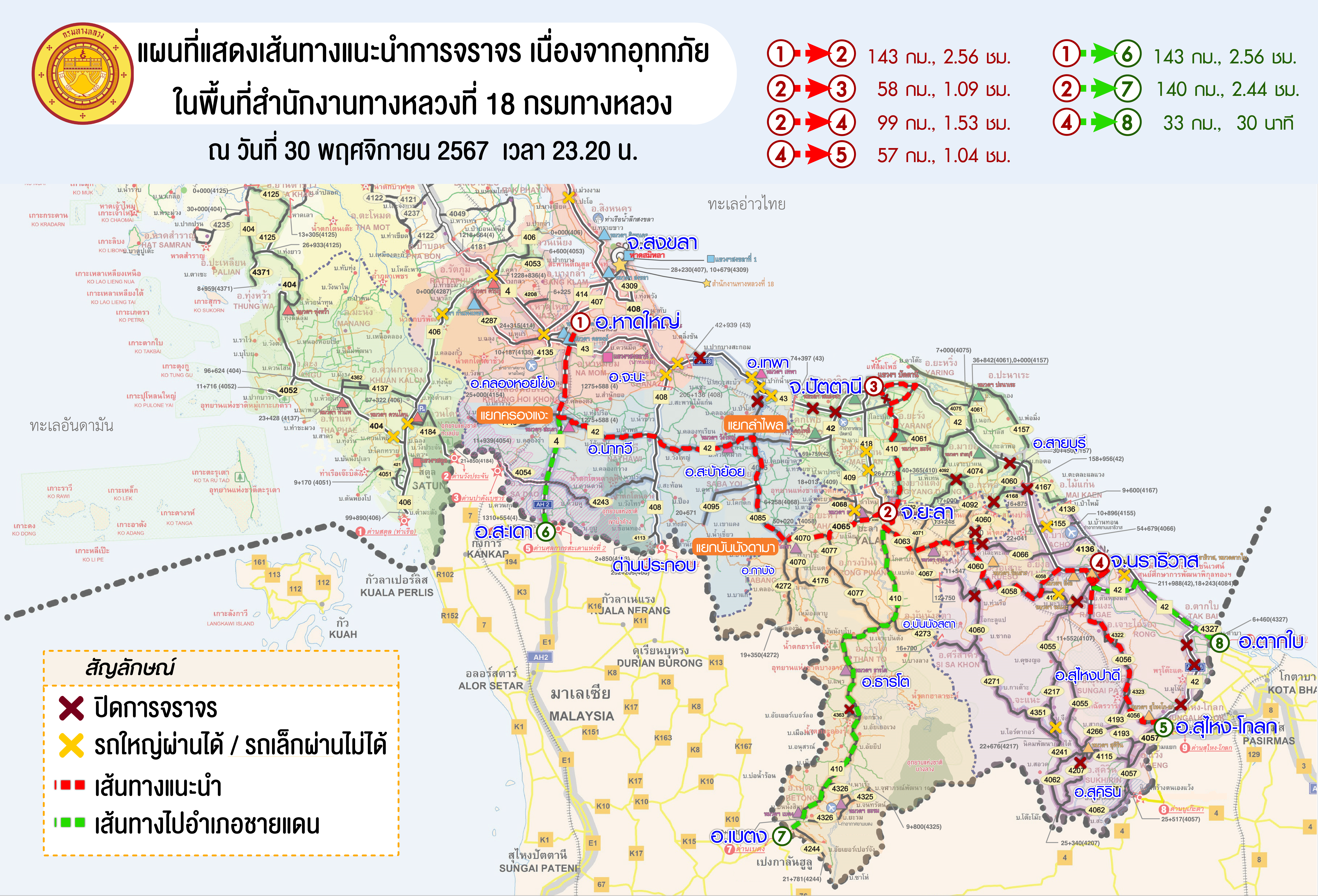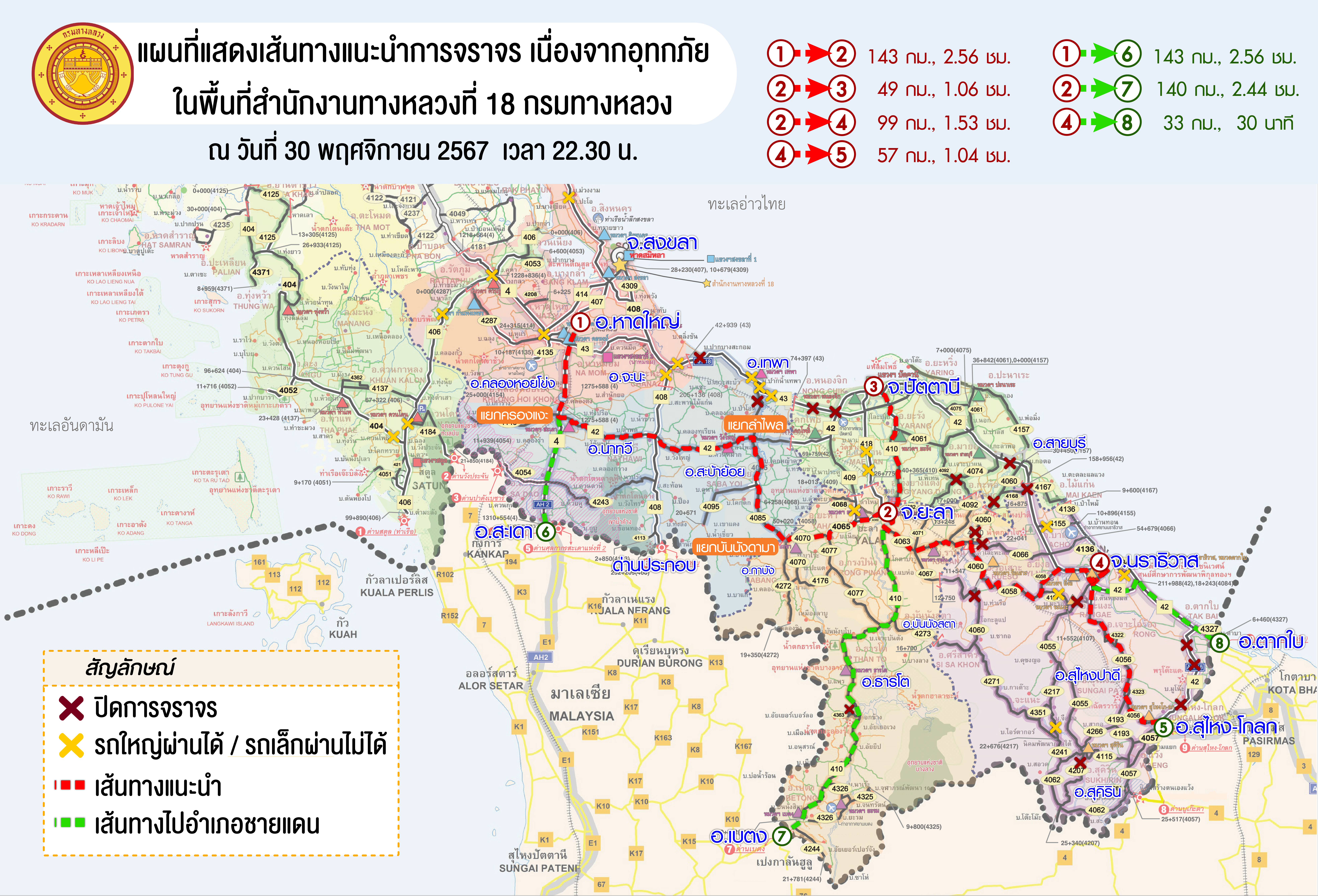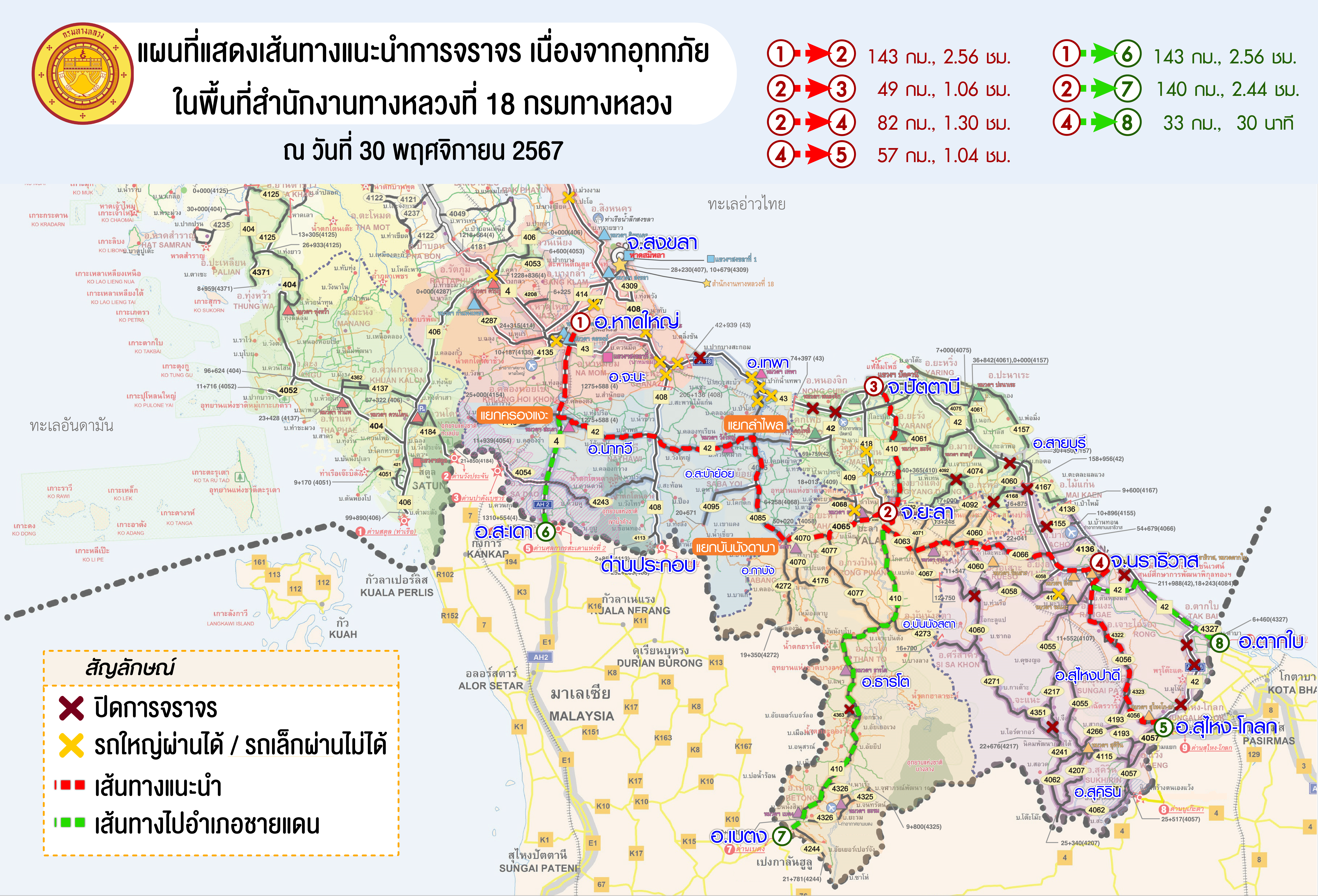 แผนที่แสดงเส้นทางแนะนำการจราจรเนื่องจากอุทกภัยในพื้นที่สำนักงานทางหลวงที่ 18 ข้อมูล ณ วันที่ 1 ธันวาคม 2567 เวลา 13.30 น.