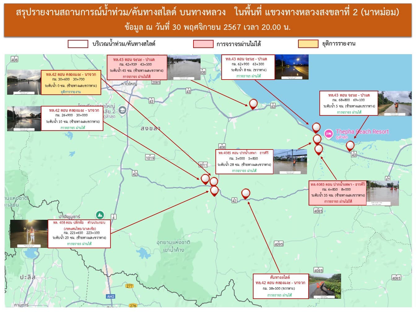 อัพเดทสถานการณ์น้ำท่วม แขวงทางหลวงสงขลาที่ 2 (นาหม่อม) วันที่ 30 พฤศจิกายน 2567 เวลา 20.00 น.