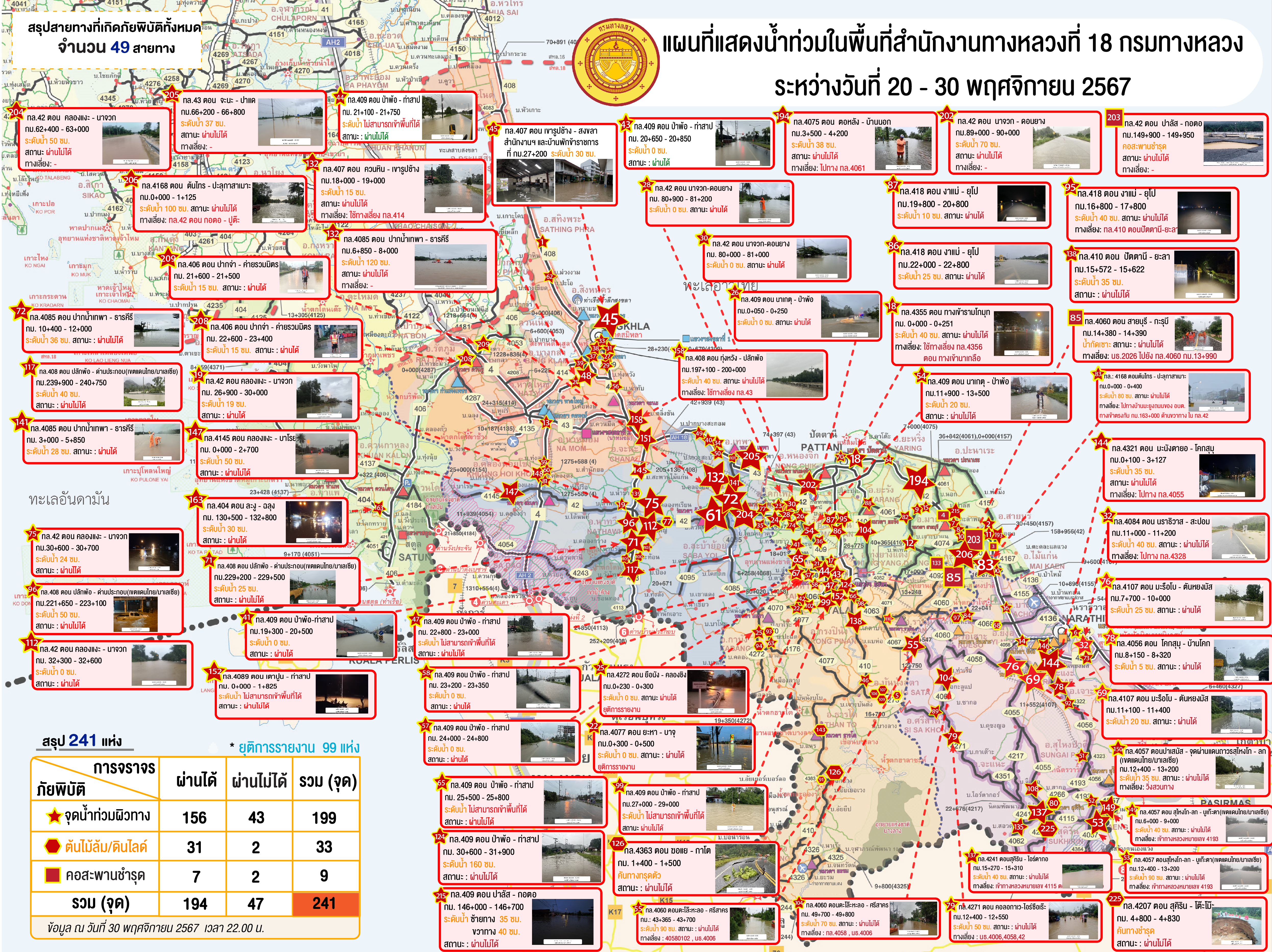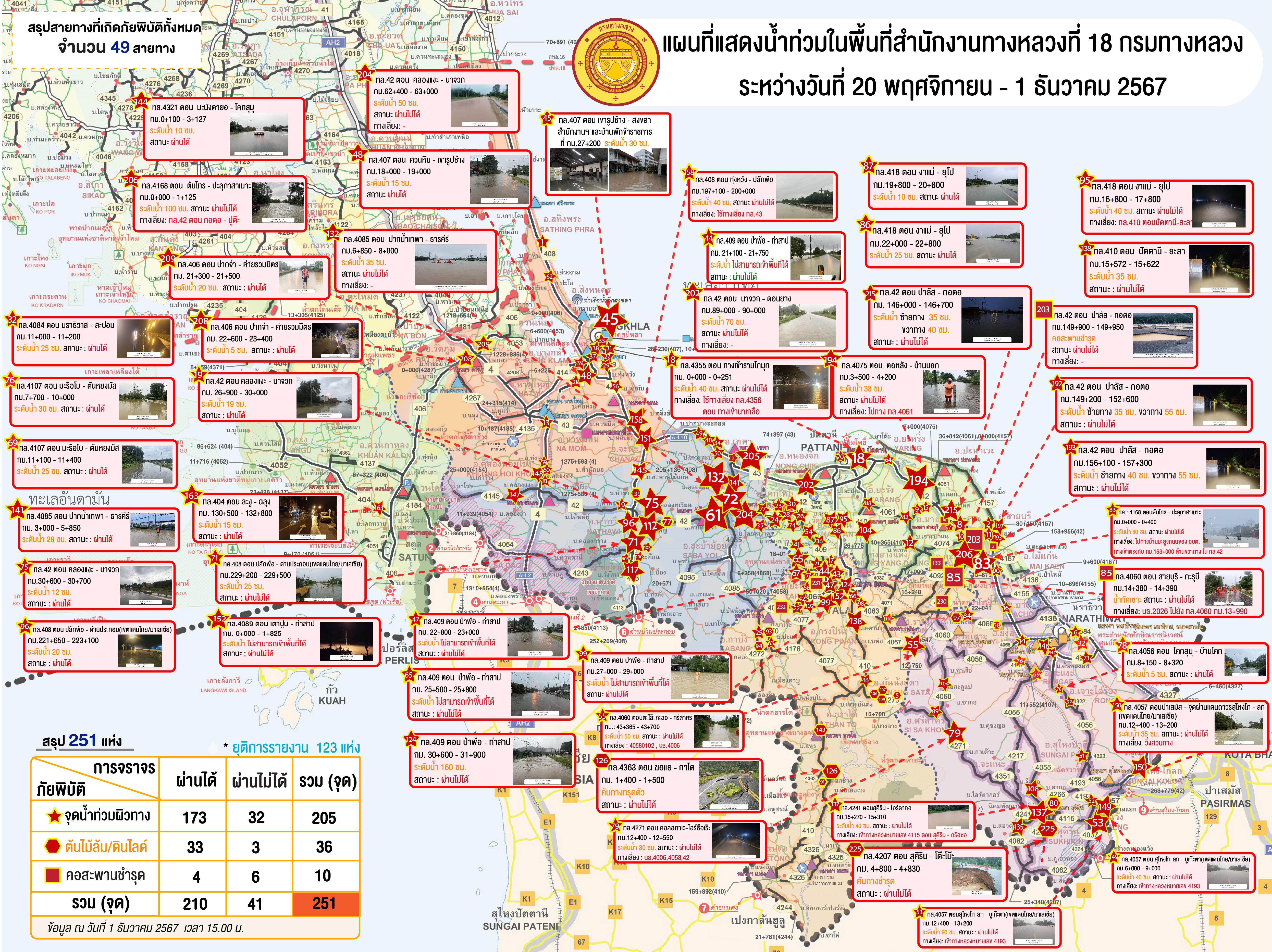 สำนักงานทางหลวงที่18ขอรายงานน้ำท่วม ระหว่างวันที่ 20 พ.ย.-1 ธ.ค. 67 ประจำวันที่ 1 ธ.ค. 67 ณ เวลา 15.00 น