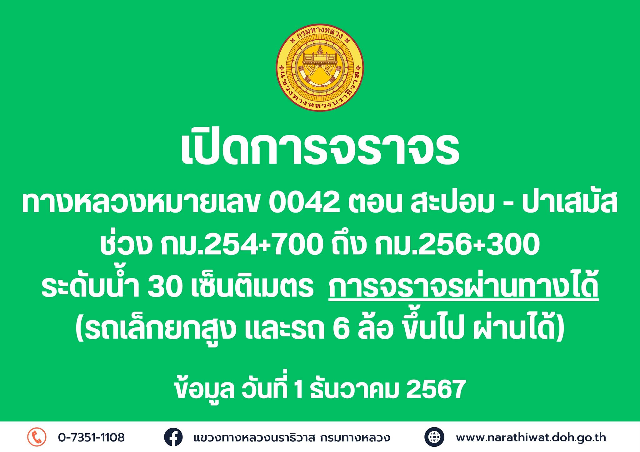 แขวงทางหลวงนราธิวาสขอแจ้งเปิดการจราจร ทางหลวงหมายเลข 0042 ตอน สะปอม - ปาเสมัส ข้อมูล วันที่ 1 ธันวาคม 2567