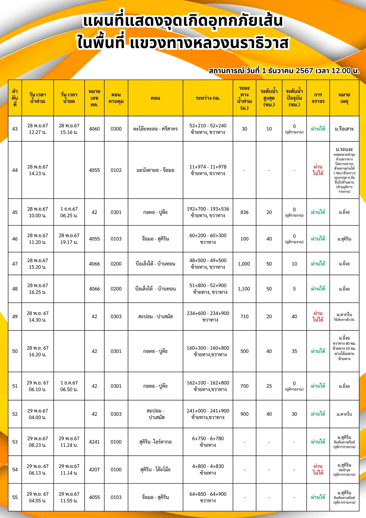 รายงานสถานการณ์อุทกภัยในพื้นที่แขวงทางหลวงนราธิวาส วันที่ 1 ธ.ค. 67 เวลา 12.00 น.