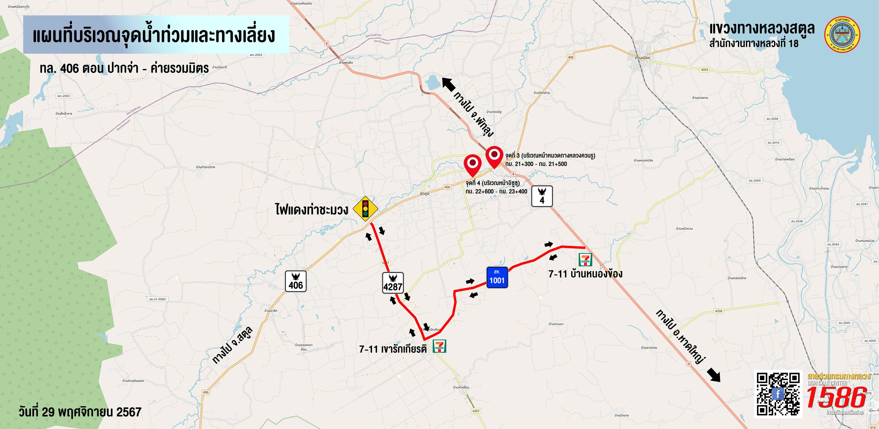 แผนที่แสดงบริเวณจุดน้ำท่วมและทางเลี่ยง แขวงทางหลวงสตูล