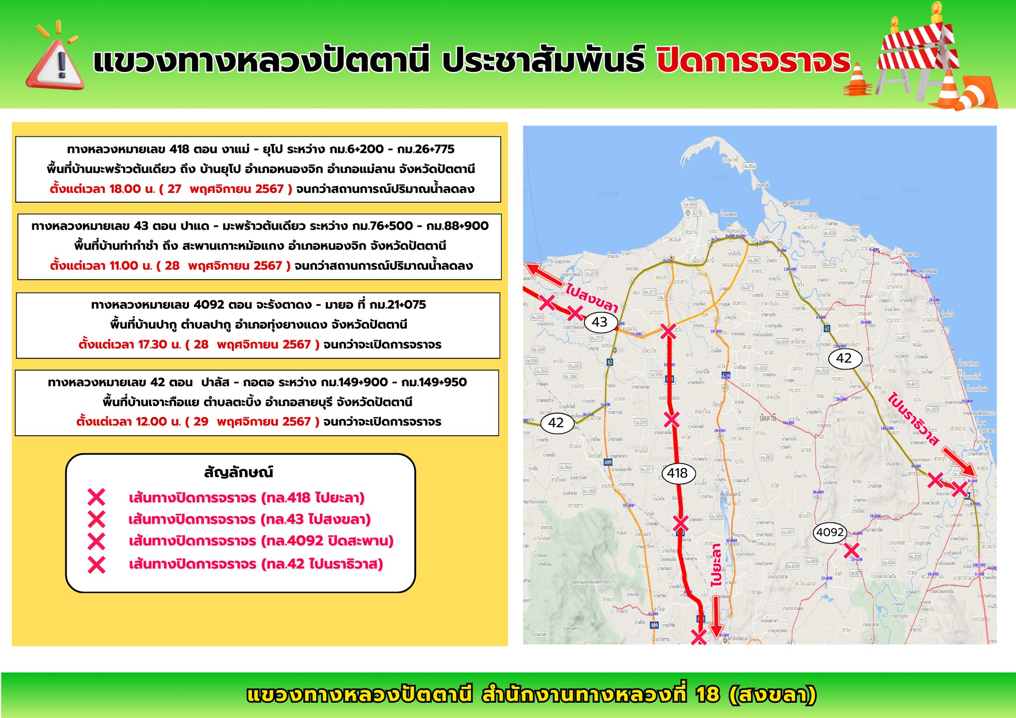 แขวงทางหลวงปัตตานีขอปิดการจราจร 3 เส้นทาง