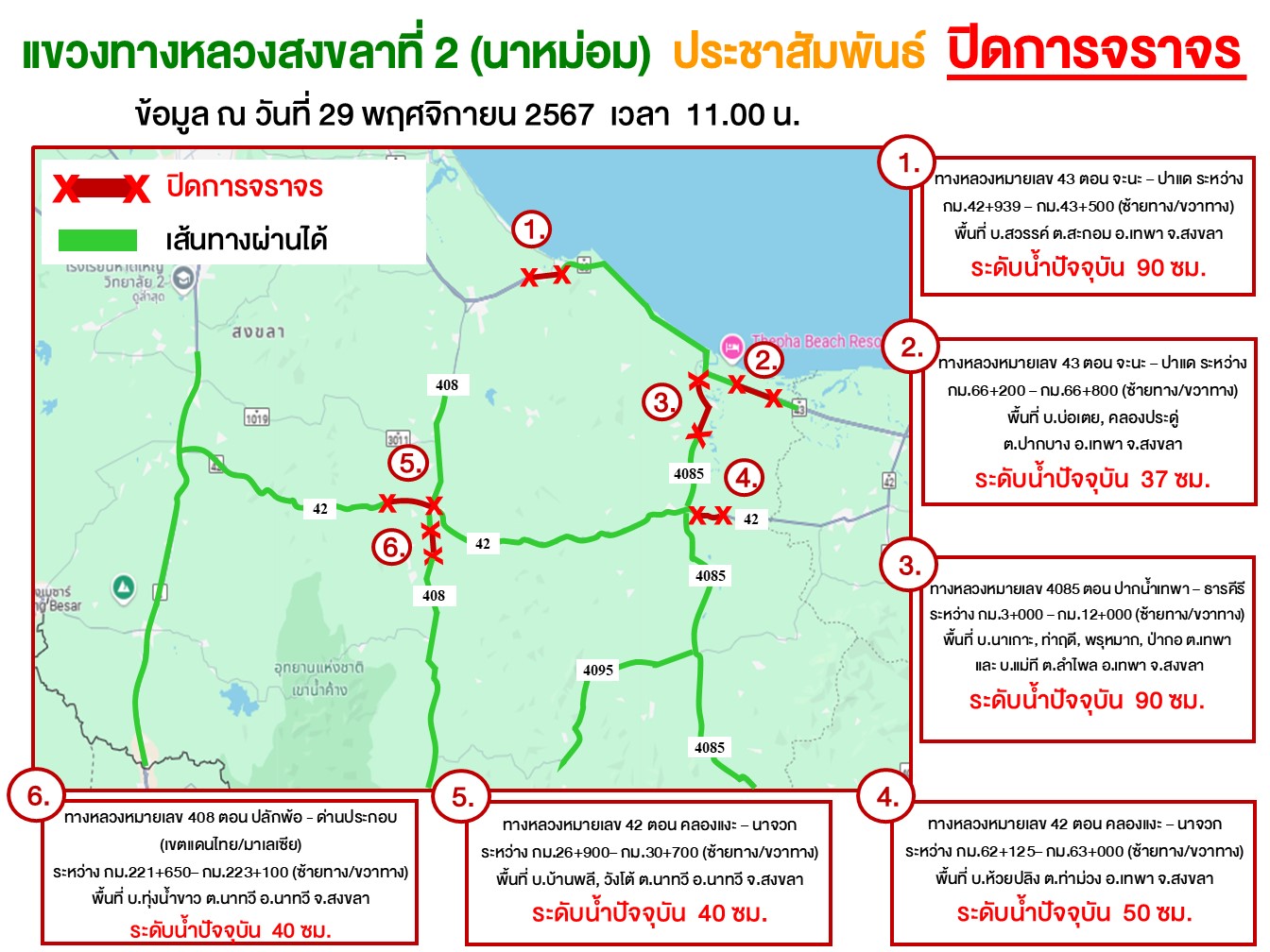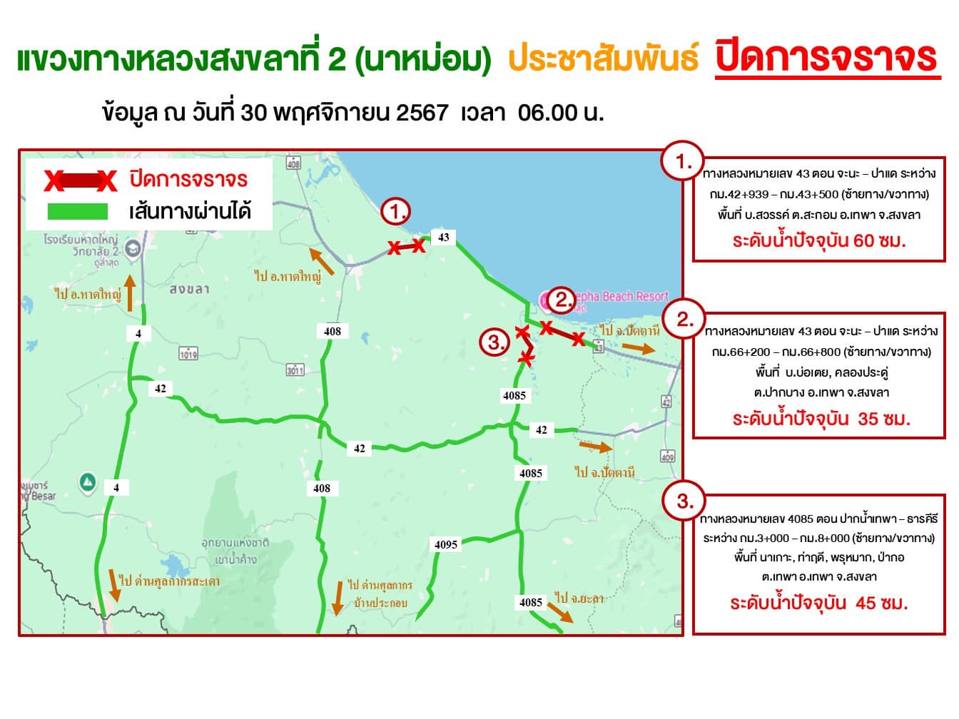 อัพเดทสถานการณ์น้ำท่วมของแขวงทางหลวงสงขลาที่2 (นาหม่อม) ณ วันที่ 30 พฤศจิกายน 2567 เวลา 06.00 น.