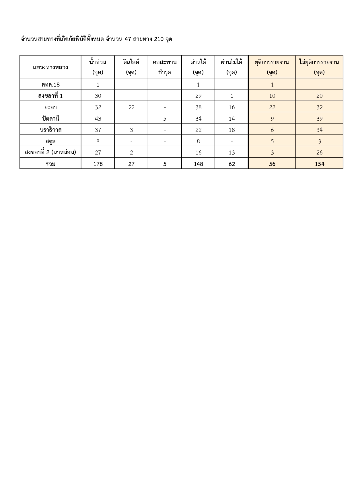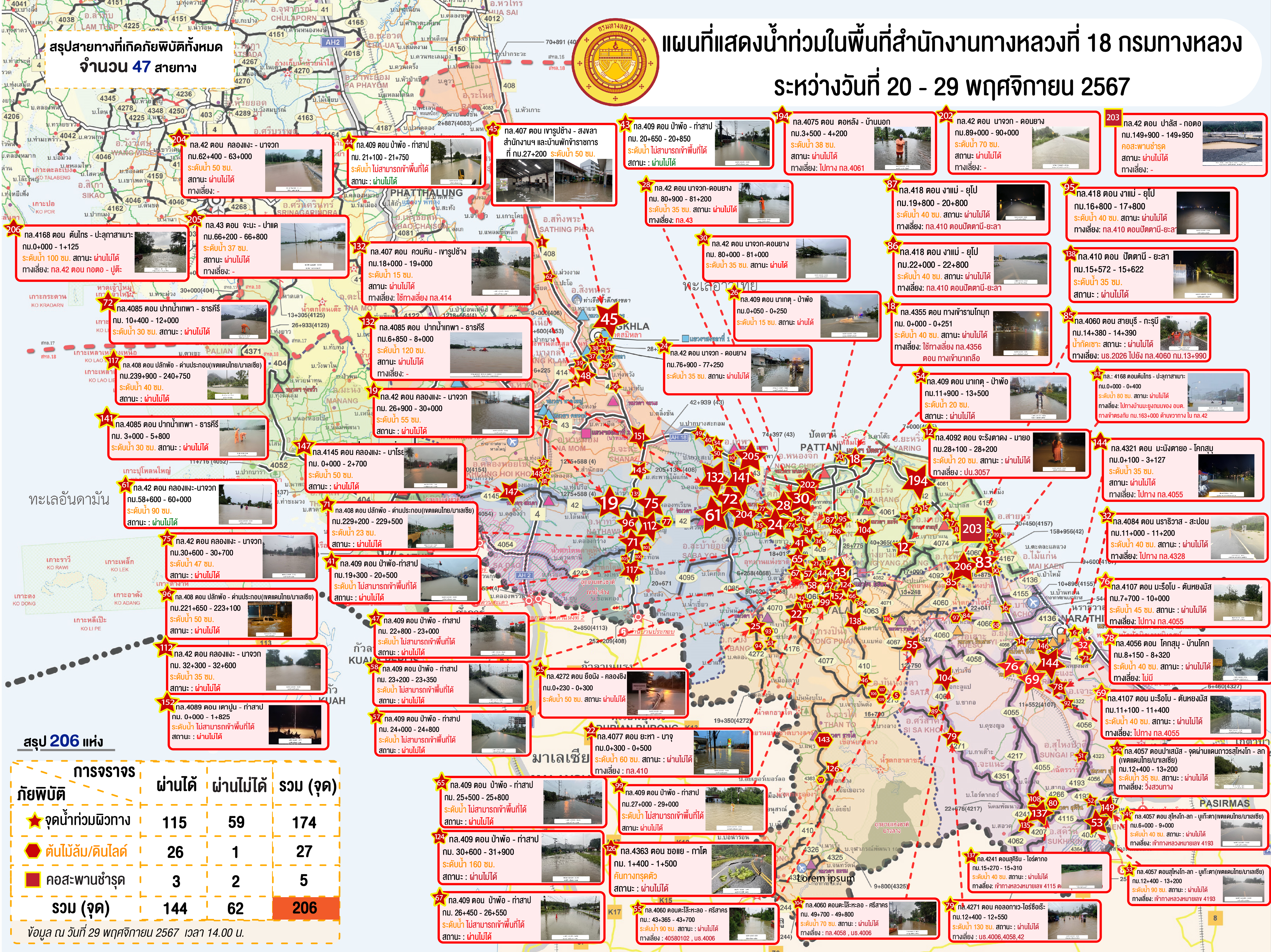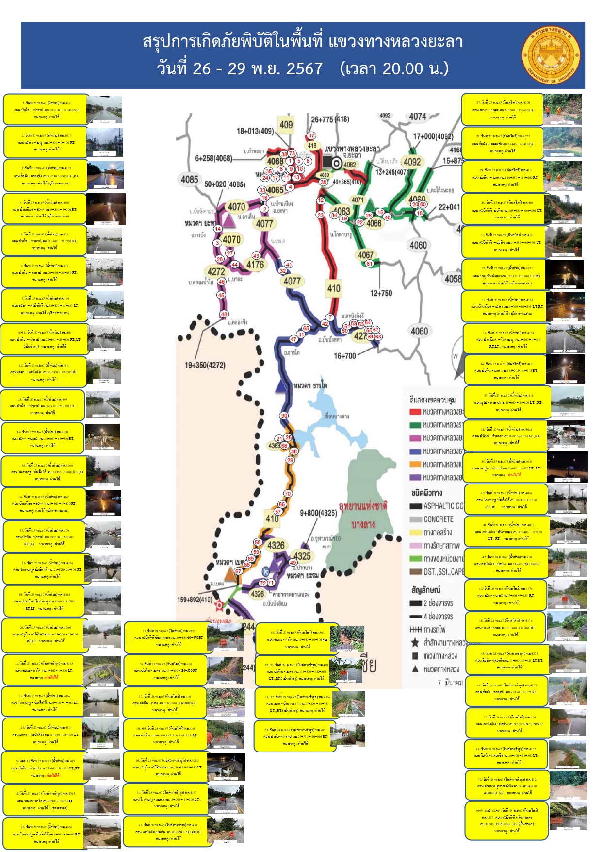 สรุปการเกิดภัยพิบัติในพื้นที่แขวงทางหลวงยะลา ข้อมูล ณ วันที่ 26-29 พฤศจิกายน 2567 เวลา 20.00 น.