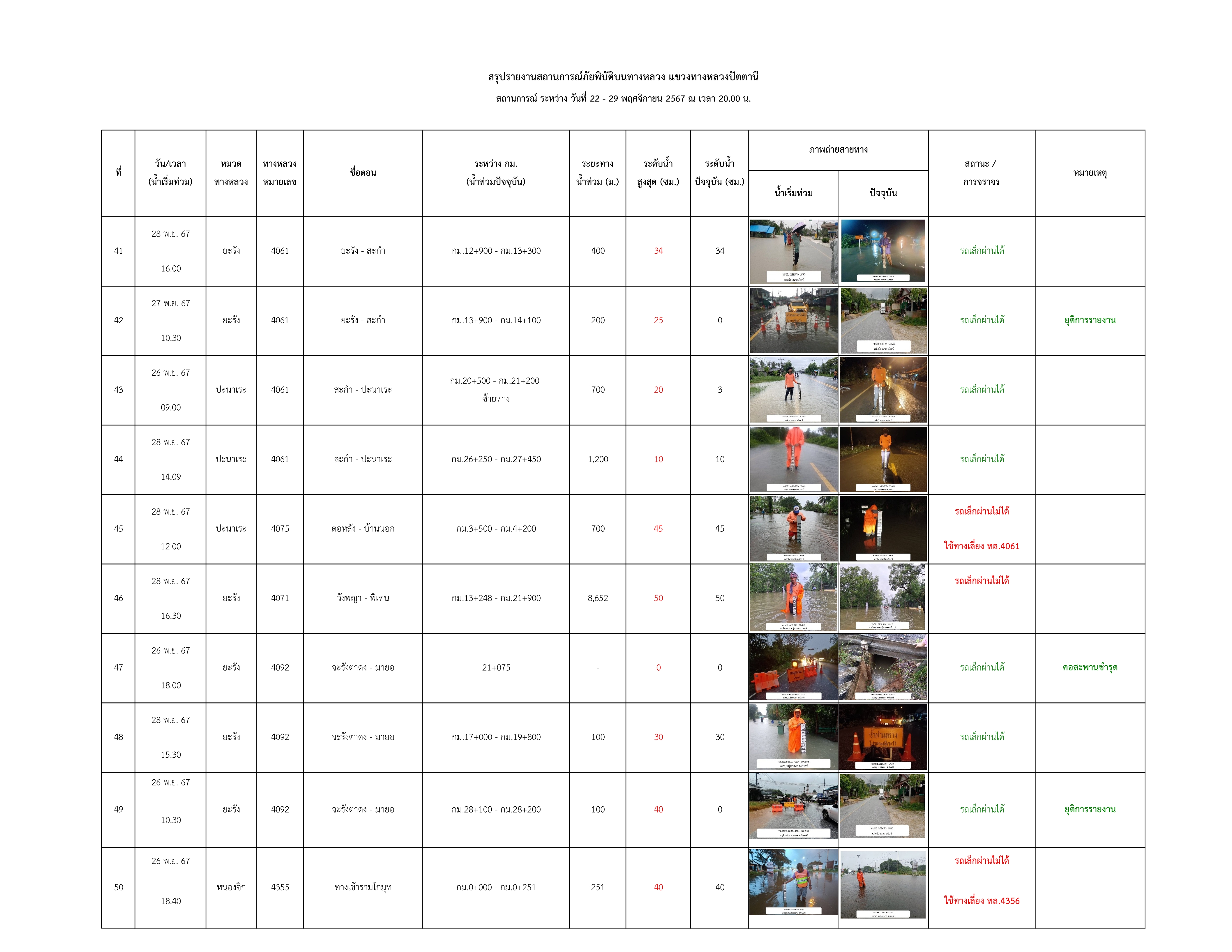 รายงานสถานการณ์น้ำท่วมในพื้นที่แขวงทางหลวงปัตตานี ข้อมูล ณ วันที่ 29 พฤศจิกายน 2567 เวลา 20.00 น.