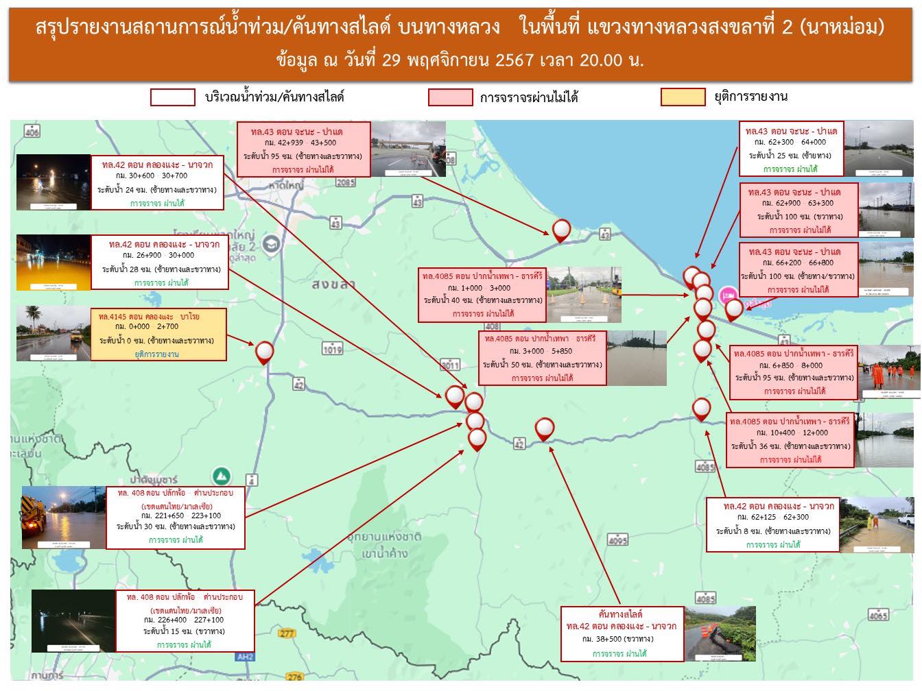 รายงานสถานการณ์น้ำท่วมในพื้นที่แขวงทางหลวงสงขลาที่ 2 (นาหม่อม) ข้อมูล ณ วันที่ 29 พฤศจิกายน 2567 เวลา 20.00