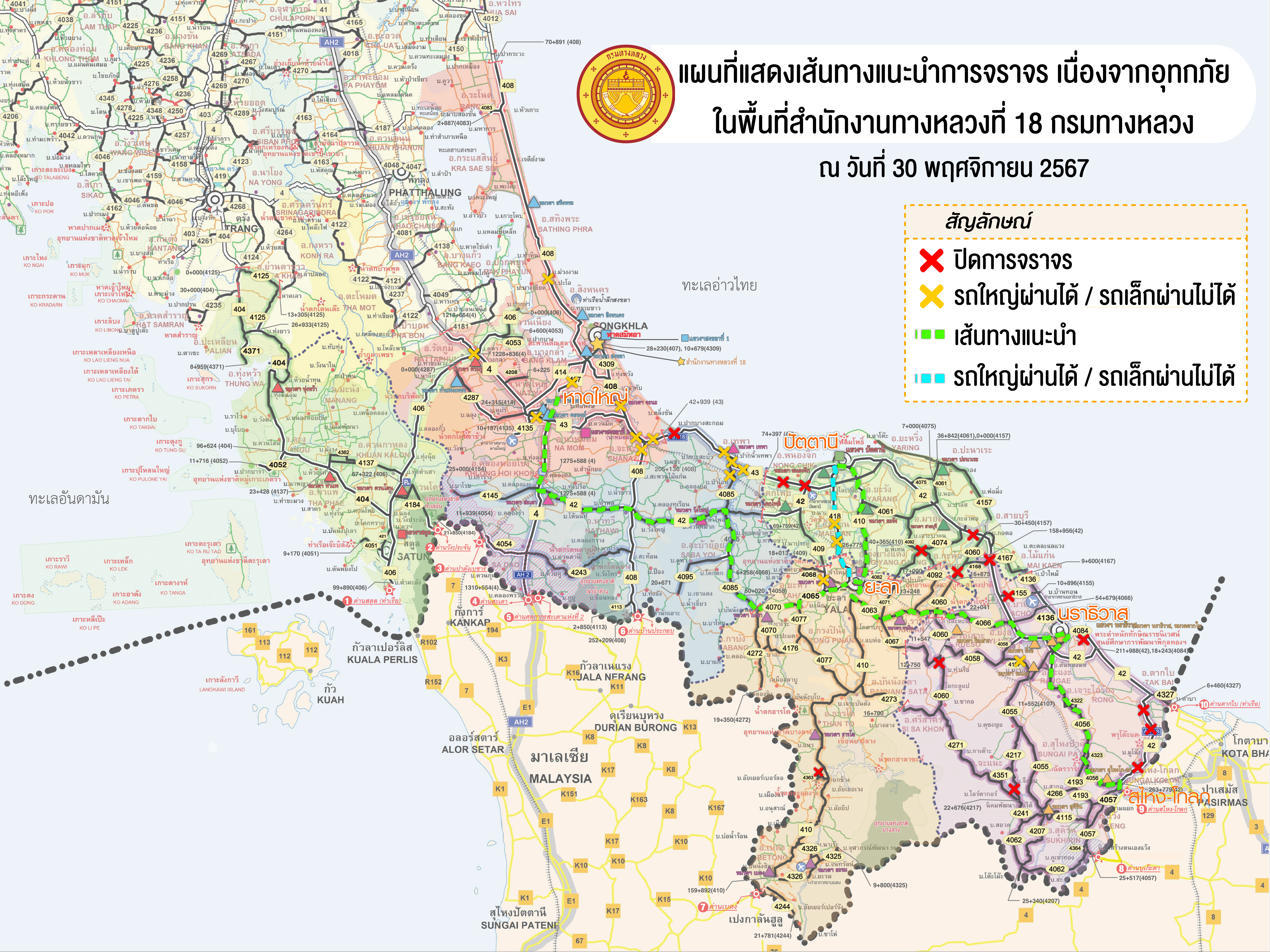 แผนที่แสดงเส้นทางแนะนำการจราจร ข้อมูล ณ วันที่ 30 พฤศจิกายน 2567