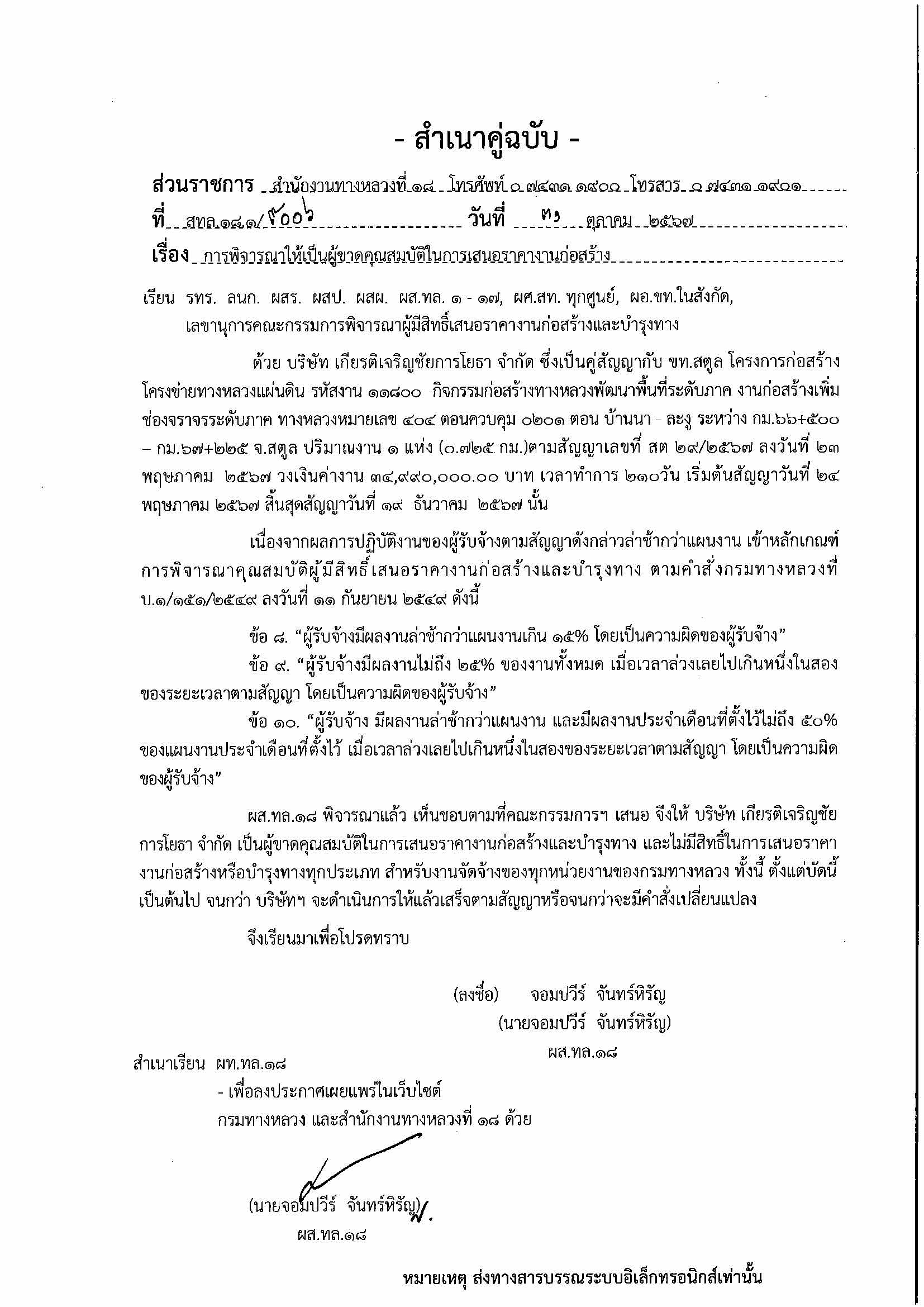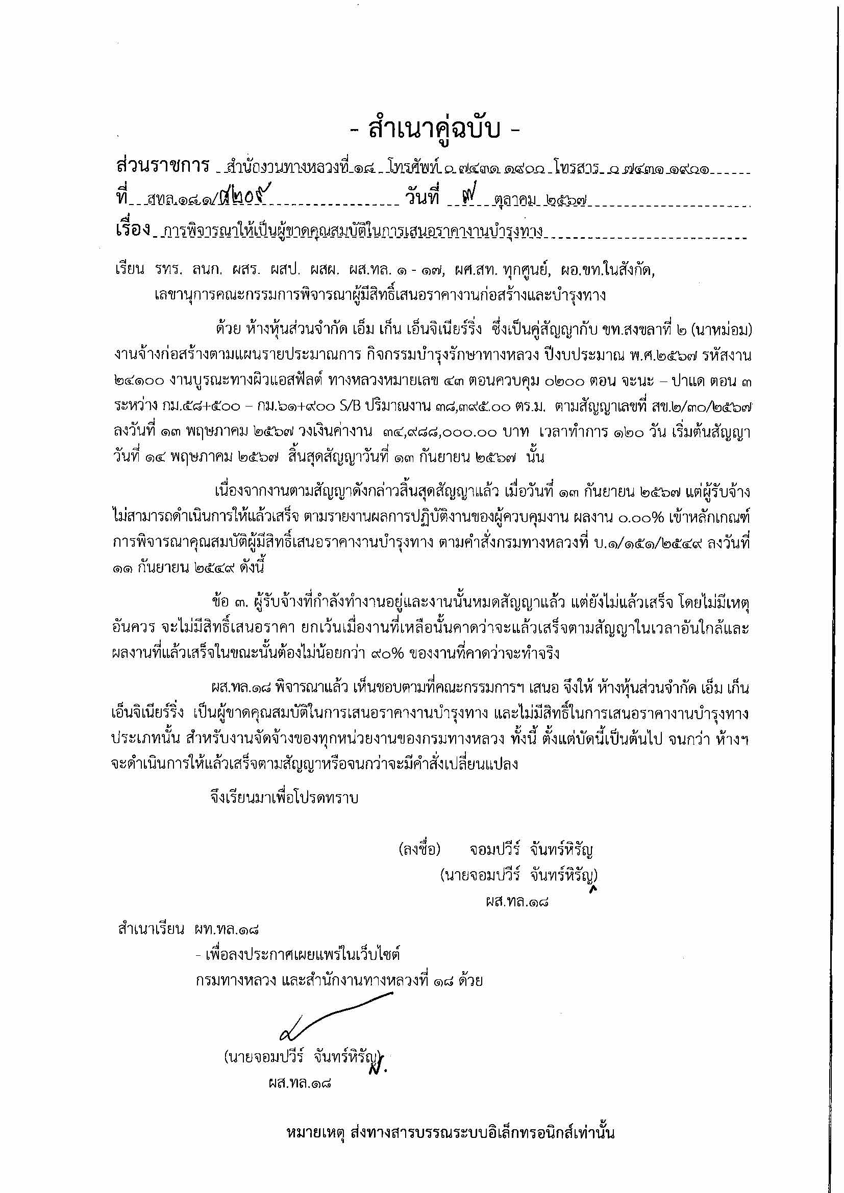 การพิจารณาให้เป็นผู้ขาดคุณสมบัติในการเสนอราคางานบำรุงทาง