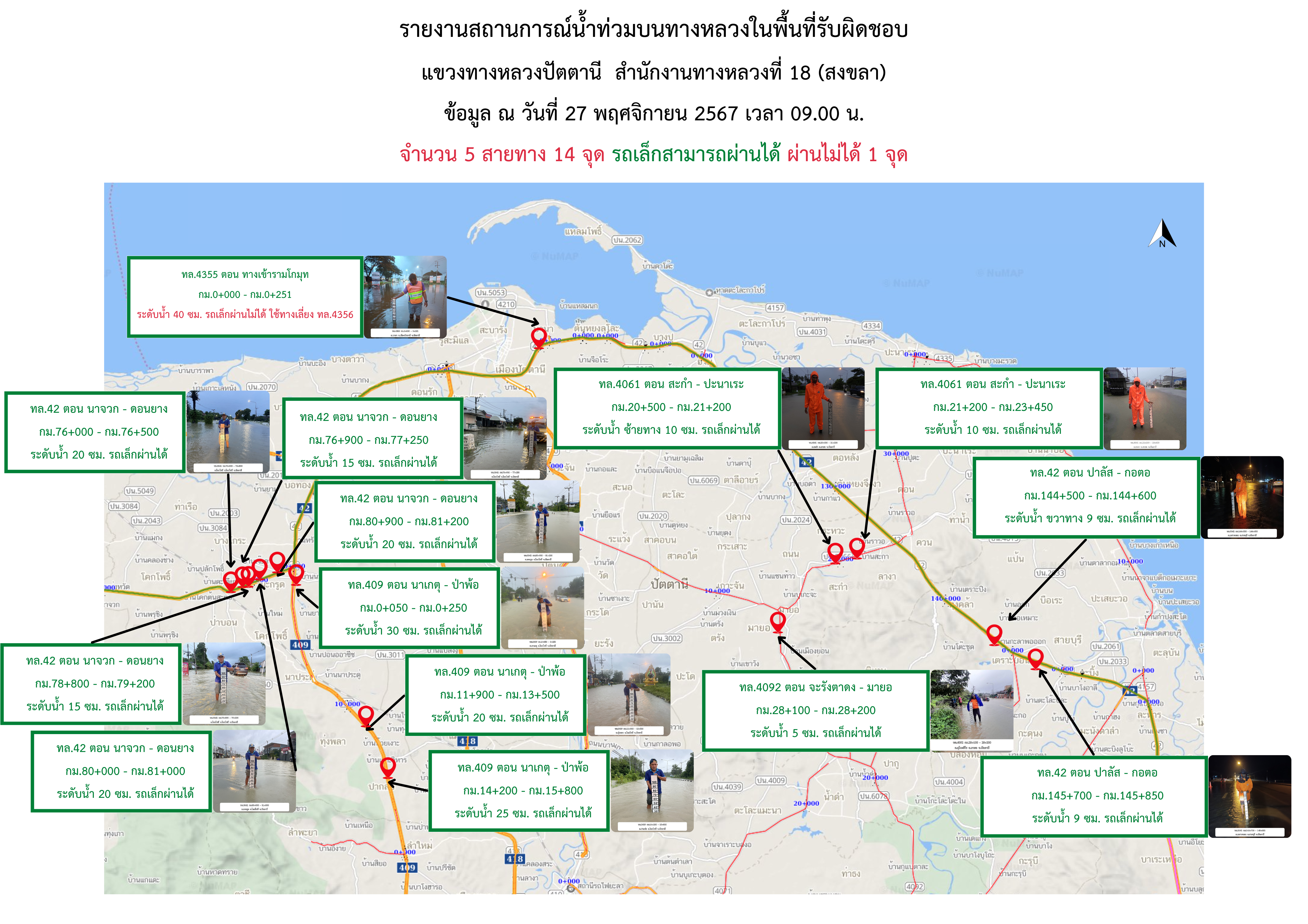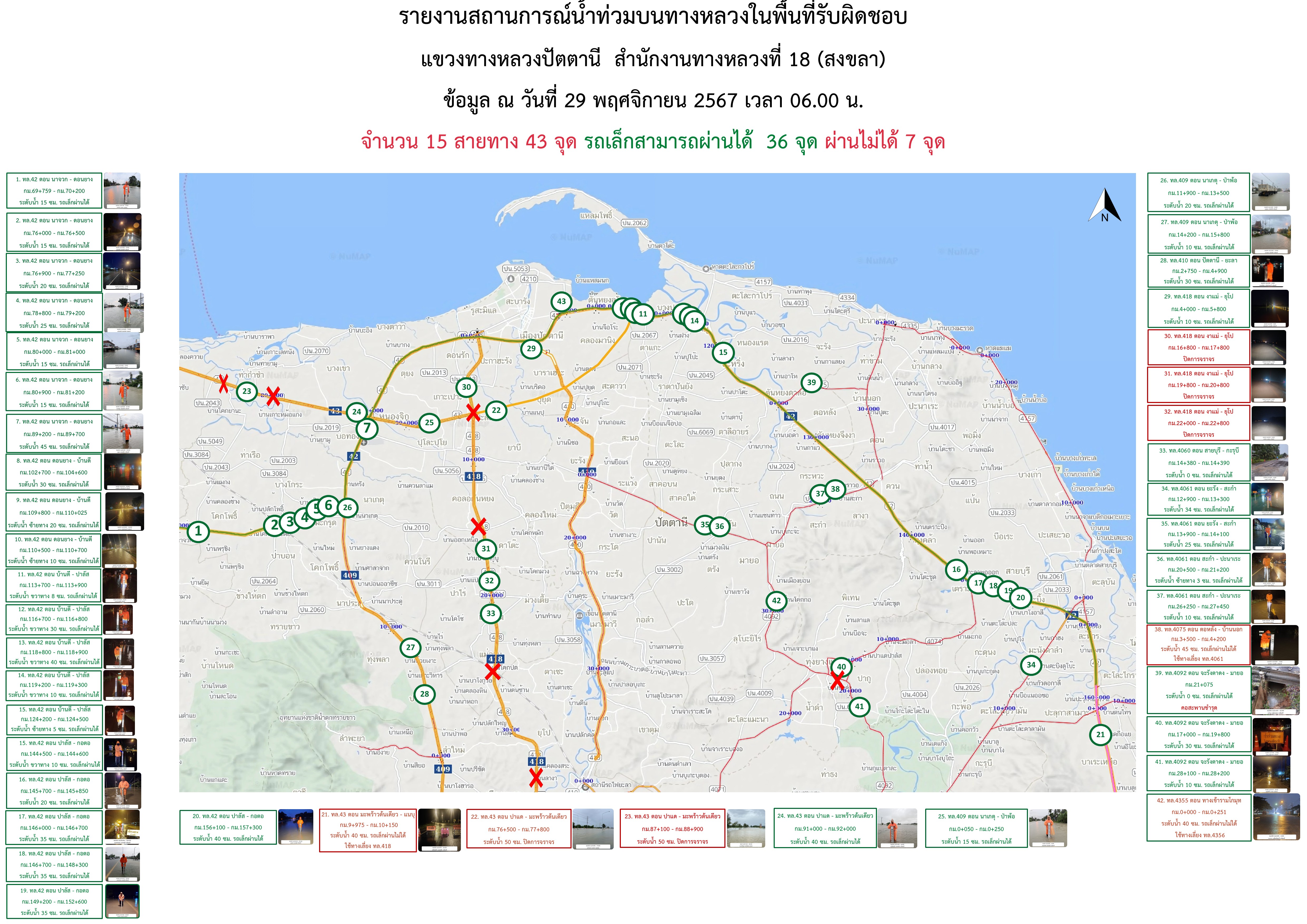 รายงานสถานการณ์น้ำท่วมในพื้นที่แขวงทางหลวงปัตตานี ข้อมูล ณ วันที่ 29 พฤศจิกายน 2567 เวลา 06.00 น.