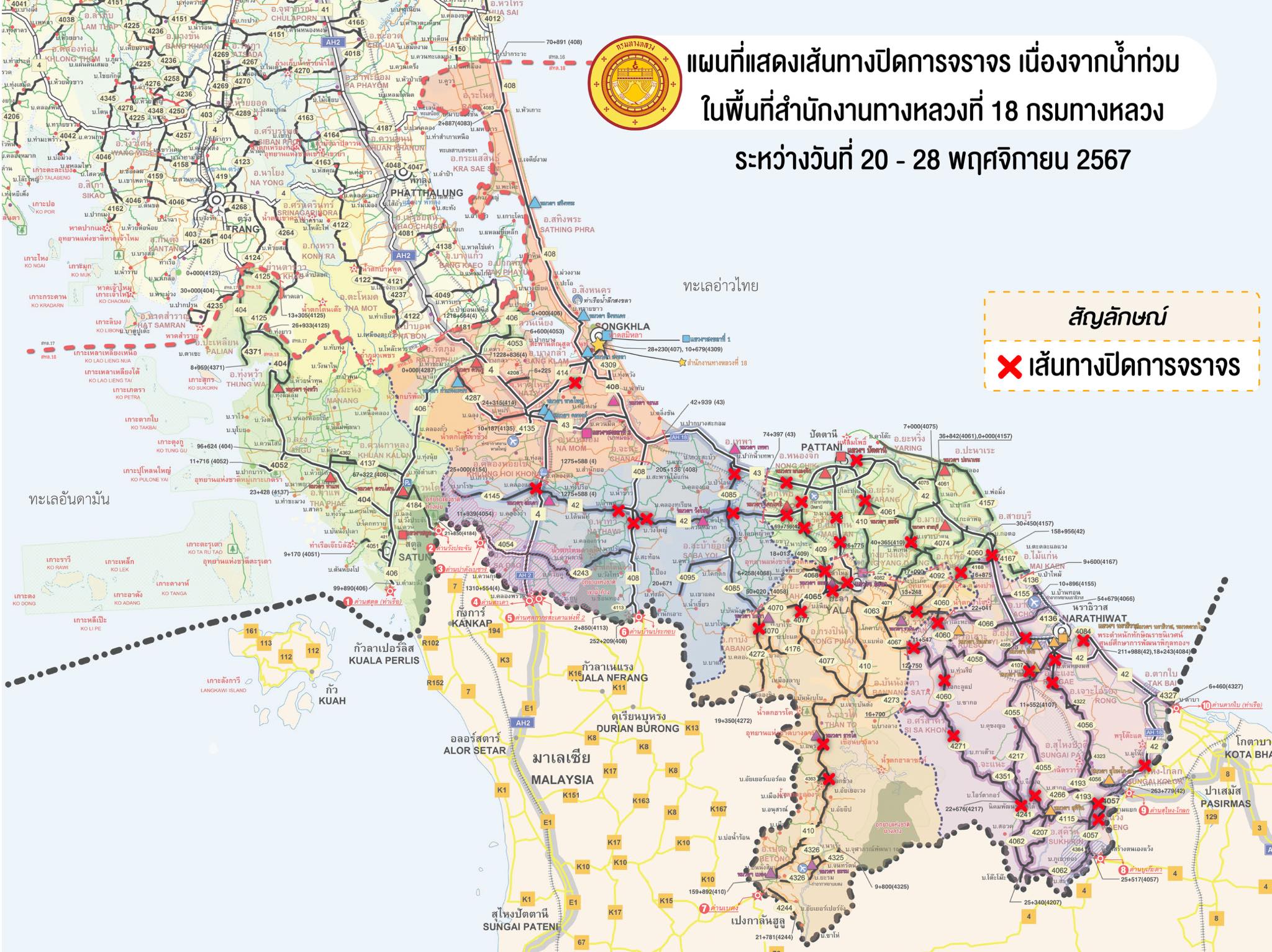 แผนที่แสดงเส้นทางปิดการจราจร เนื่องจากน้ำท่วม ในพื้นที่สำนักงานทางหลวงที่ 18