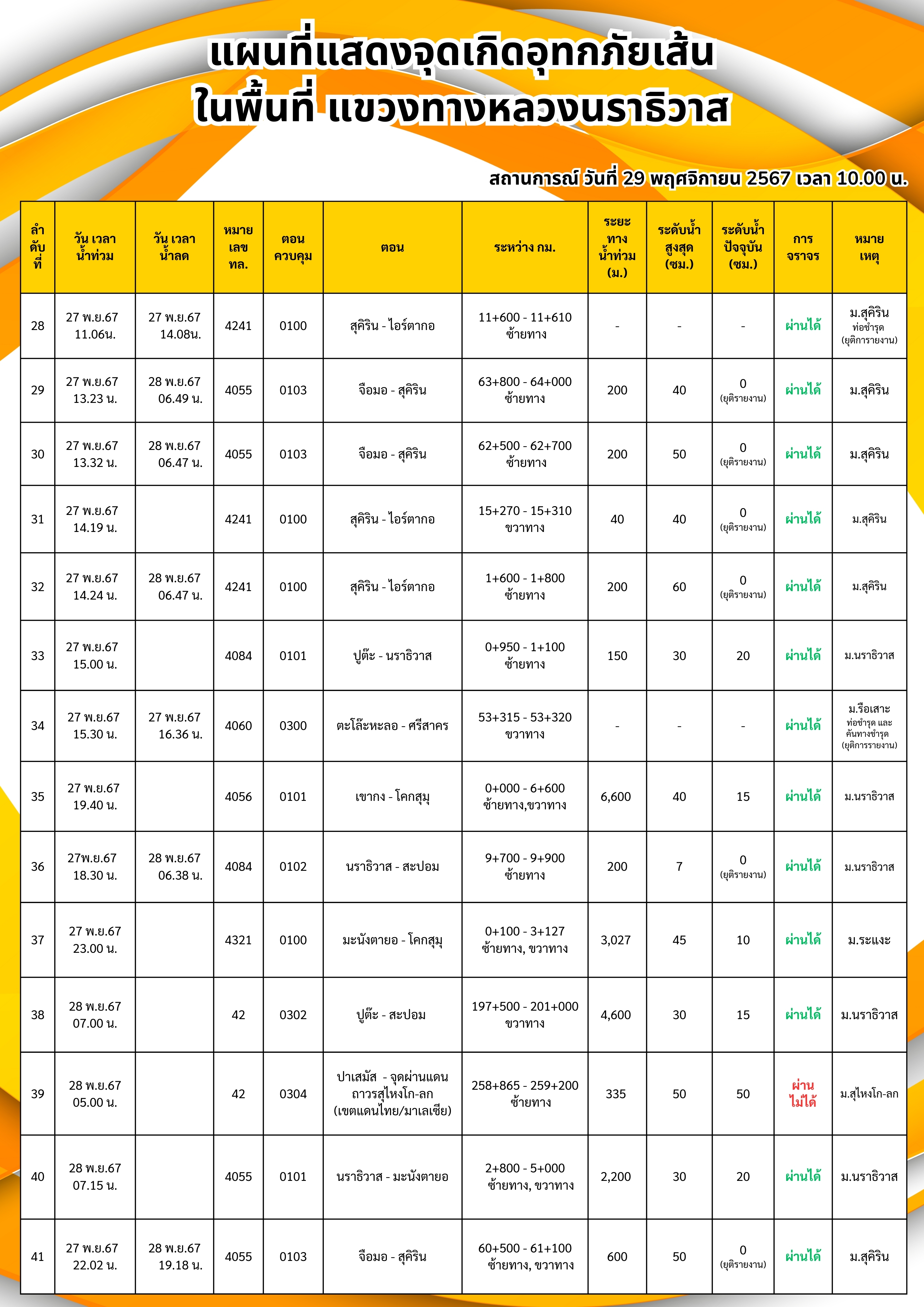 สรุปการเกิดภัยพิบัติในพื้นที่แขวงทางหลวงยะลา ข้อมูล ณ วันที่ 26-29 พฤศจิกายน 2567