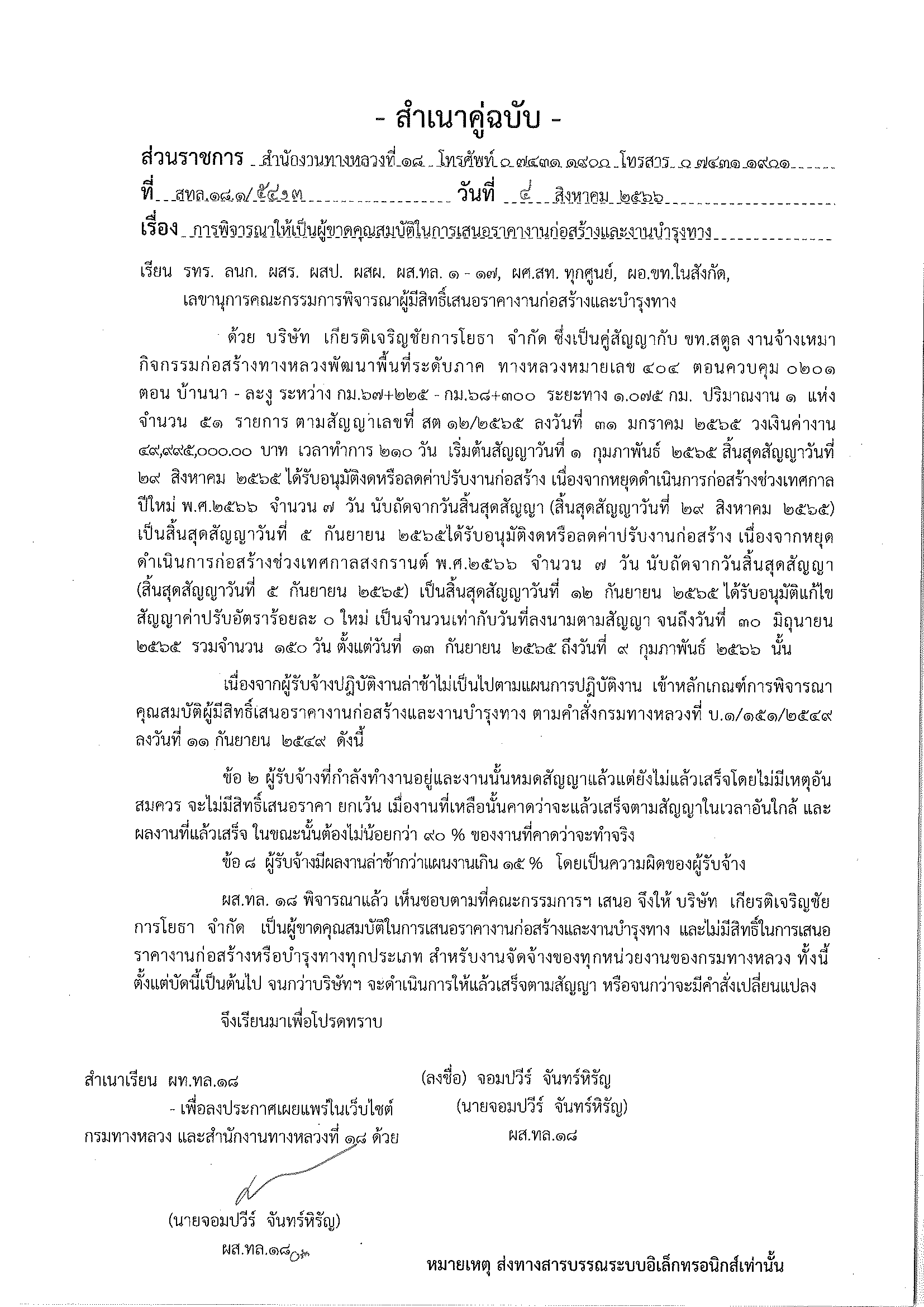 การพิจารณาให้เป็นผู้ขาดคุณสมบัติในการเสนอราคางานก่อสร้างและบำรุงทาง