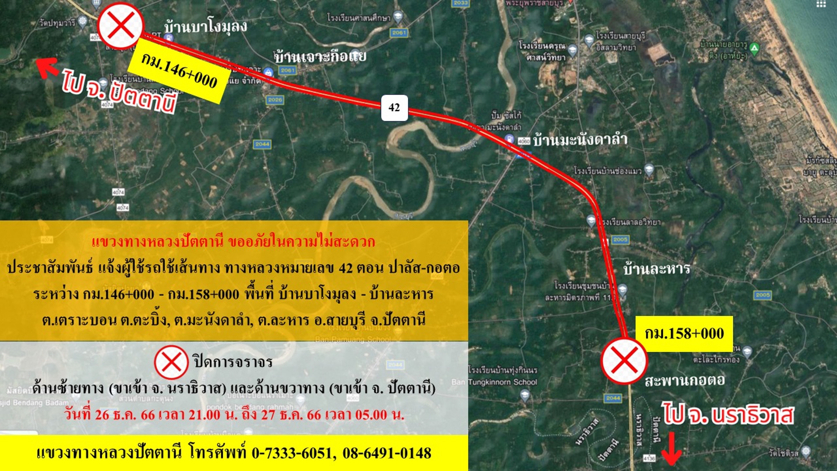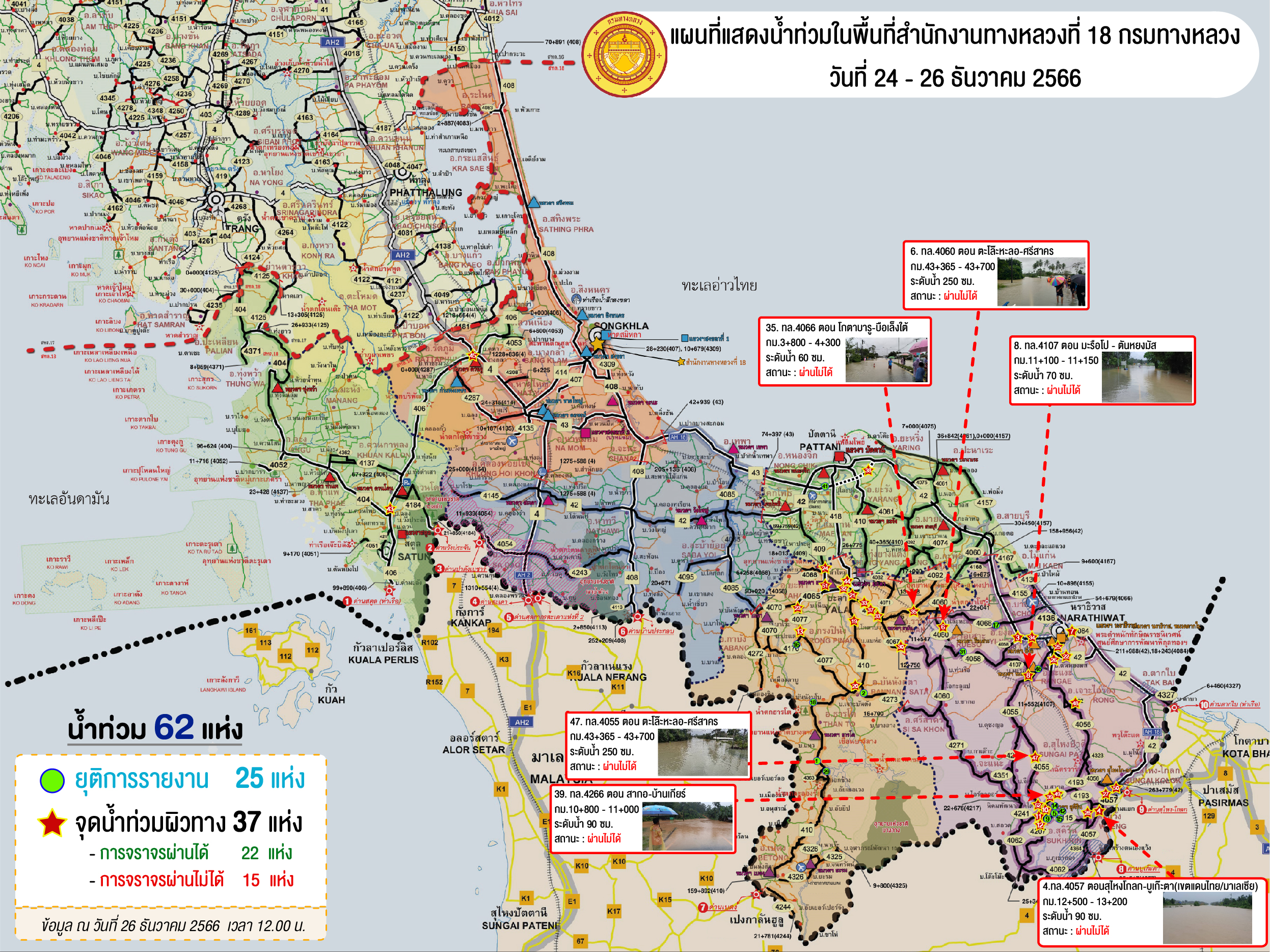 สรุปข้อมูลน้ำท่วม และการปิดการจราจร เส้นทางในความควบคุม เส้นทางเลี่ยง จาก จ.นราธิวาส – จ.ปัตตานี – จ.ยะลา – จ.สงขลา