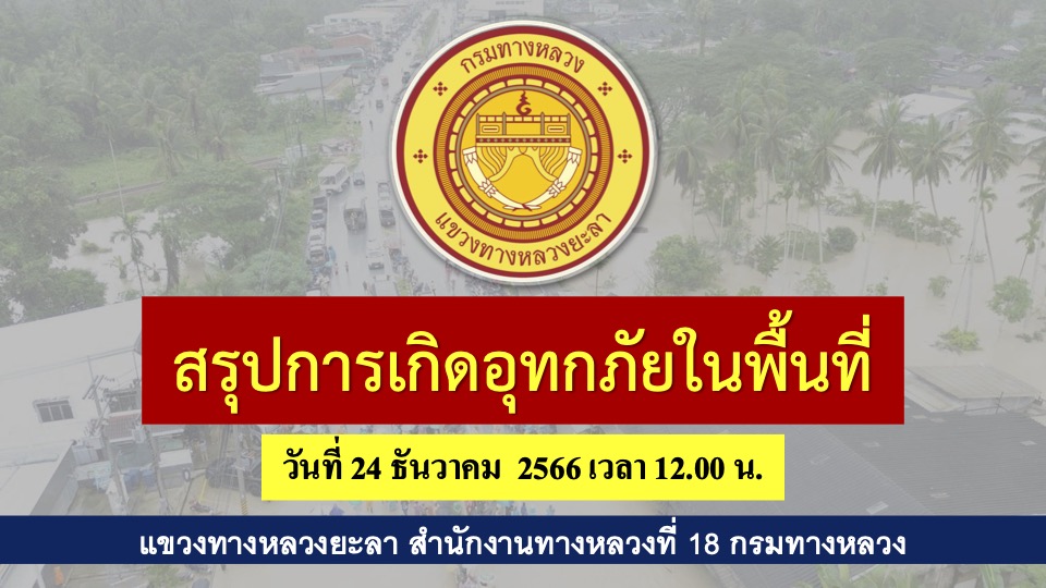 สรุปการเกิดอุทกภัยในพื้นที่แขวงทางหลวงยะลา สำนักงานทางหลวงที่ 18 กรมทางหลวง ันที่ 24 ธันวาคม 2566 เวลา 12.00 น.