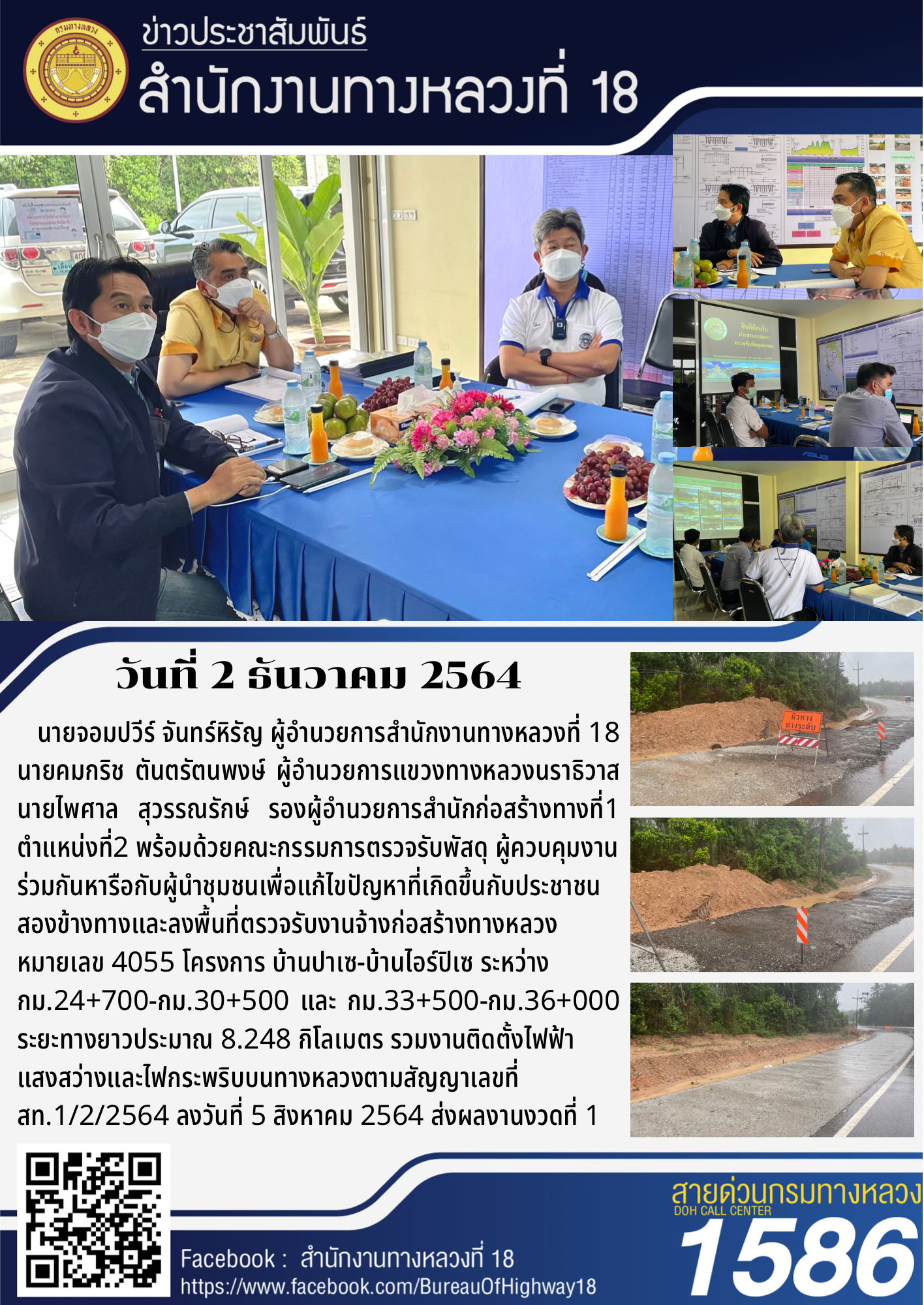 ตรวจรับงานจ้างก่อสร้างทางหลวงหมายเลข 4055 โครงการ บ้านปาเซ-บ้านไอร์ปิเซ ระหว่าง กม.24+700 - กม.30+500 และ กม.33+500 - กม.36+000