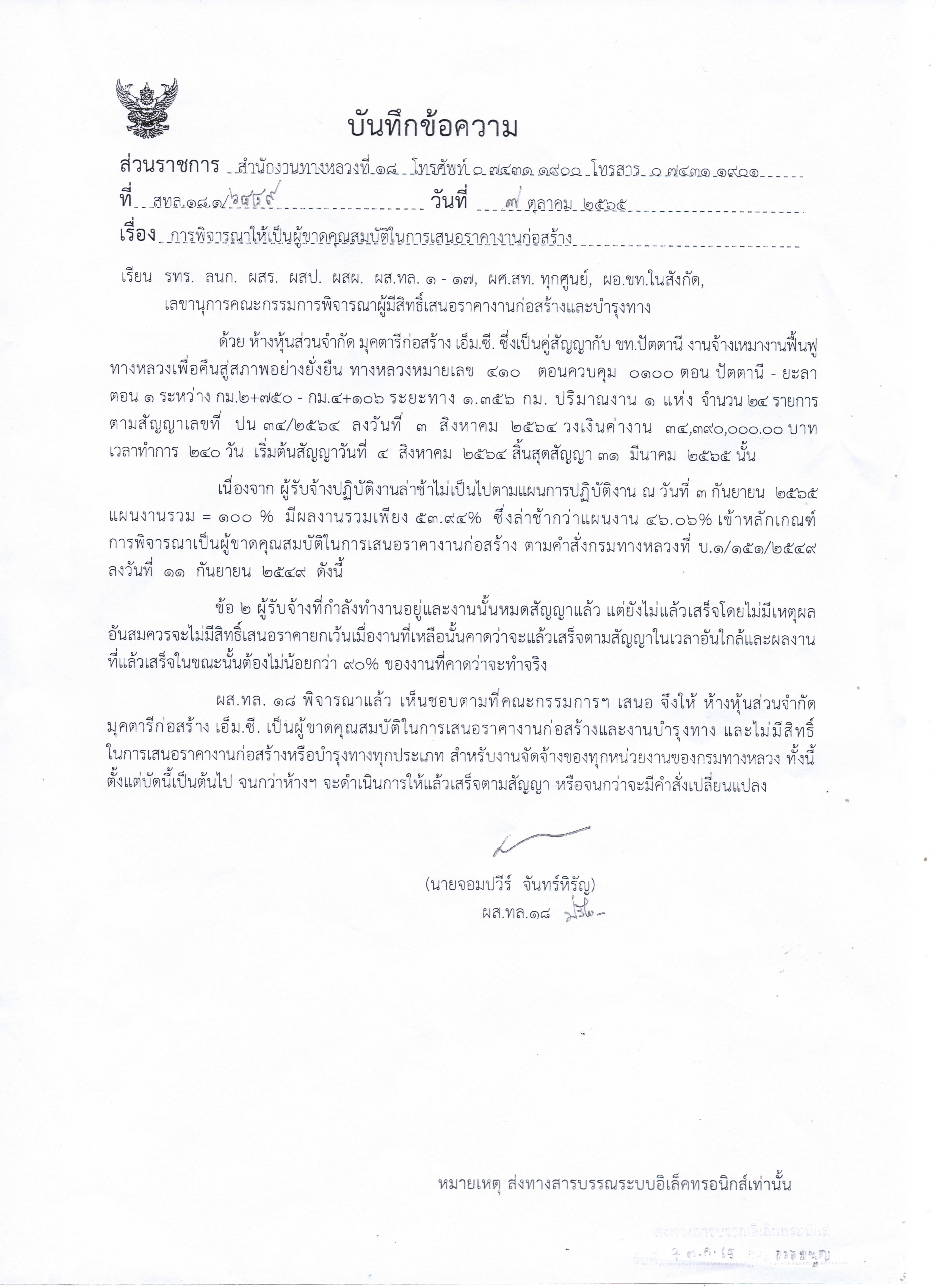 การพิจารณาให้เป็นผู้ขาดคุณสมบัติในการเสนอราคางานก่อสร้าง