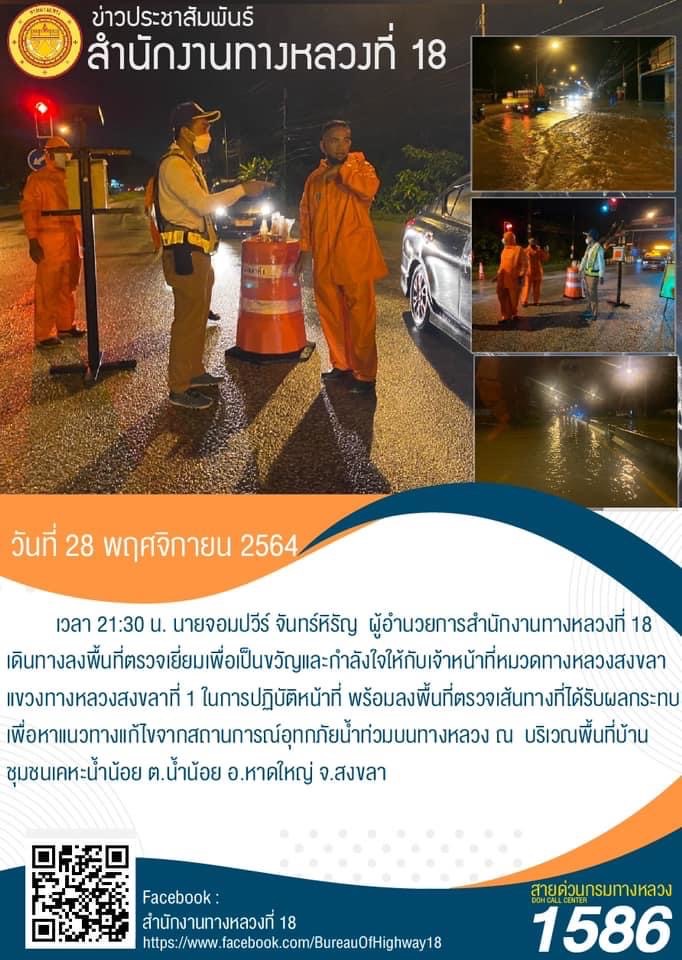ลงพื้นที่ตรวจเส้นทางที่ได้รับผลกระทบเพื่อหาแนวทางแก้ไขจากสถานการณ์อุทกภัยน้ำท่วมบนทางหลวง ณ บริเวณพื้นที่บ้านชุมชนเคหะน้ำน้อย ต.น้ำน้อย อ.หาดใหญ่ จ.สงขลา