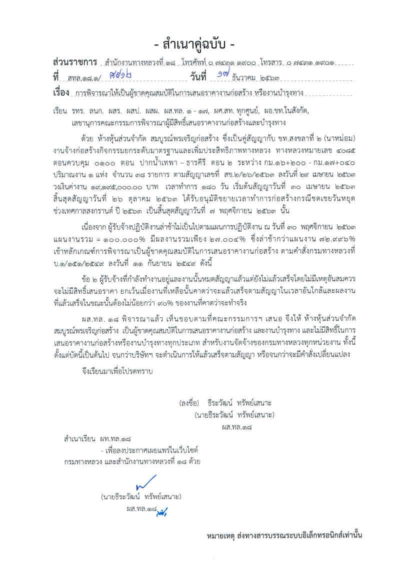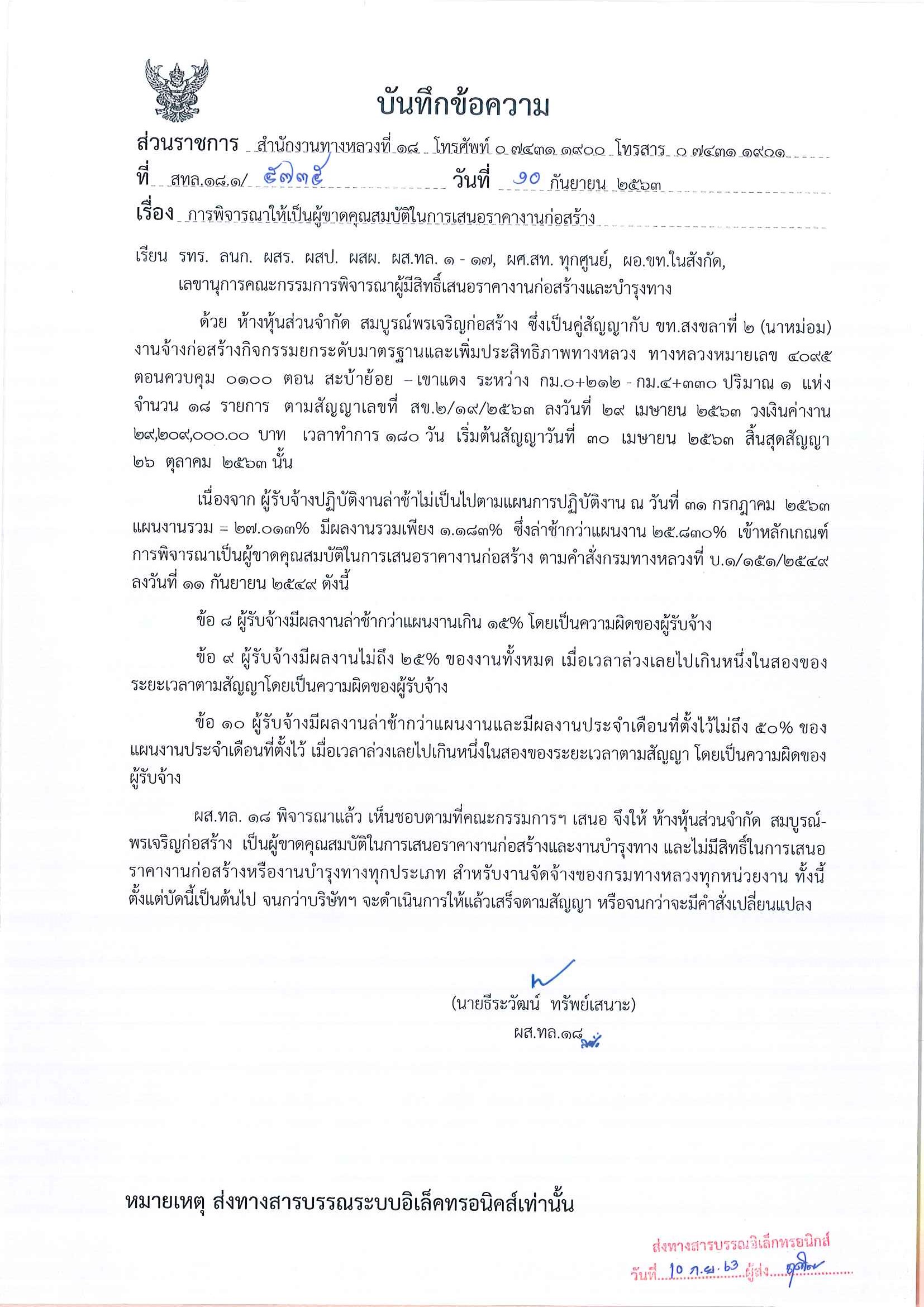 การพิจารณาให้ ห้างหุ้นส่วนจำกัด สมบูรณ์พรเจริญก่อสร้าง เป็นผู้ขาดคุณสมบัติในการเสนอราคางานก่อสร้างและบำรุงทาง