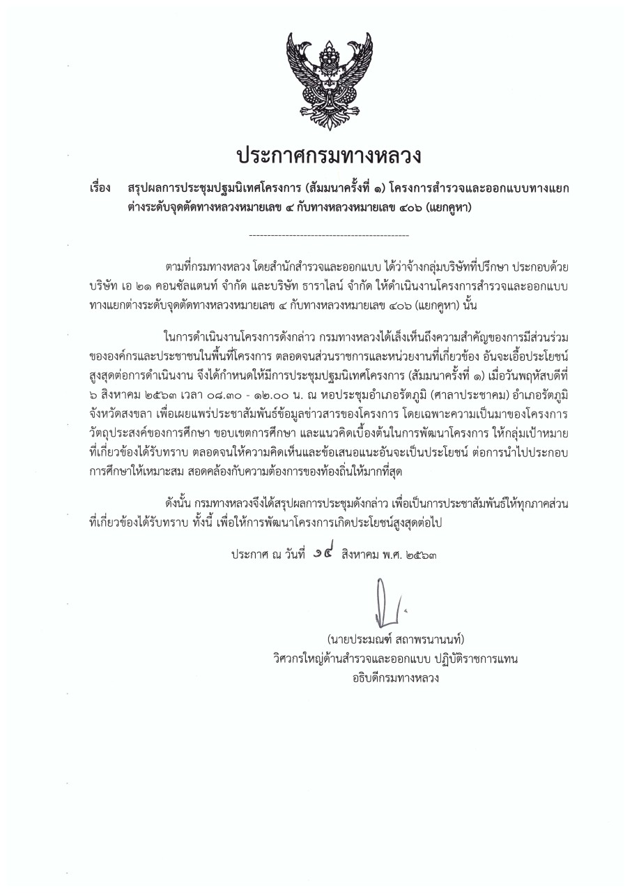 สรุปผลการประชุมปฐมนิเทศโครงการ (สัมมนา ครั้งที่ 1) โครงการสำรวจและออกแบบทางแยกต่างระดับจุดตัดทางหลวงหมายเลข 4 กับทางหลวงหมายเลข 406 (แยกคูหา)