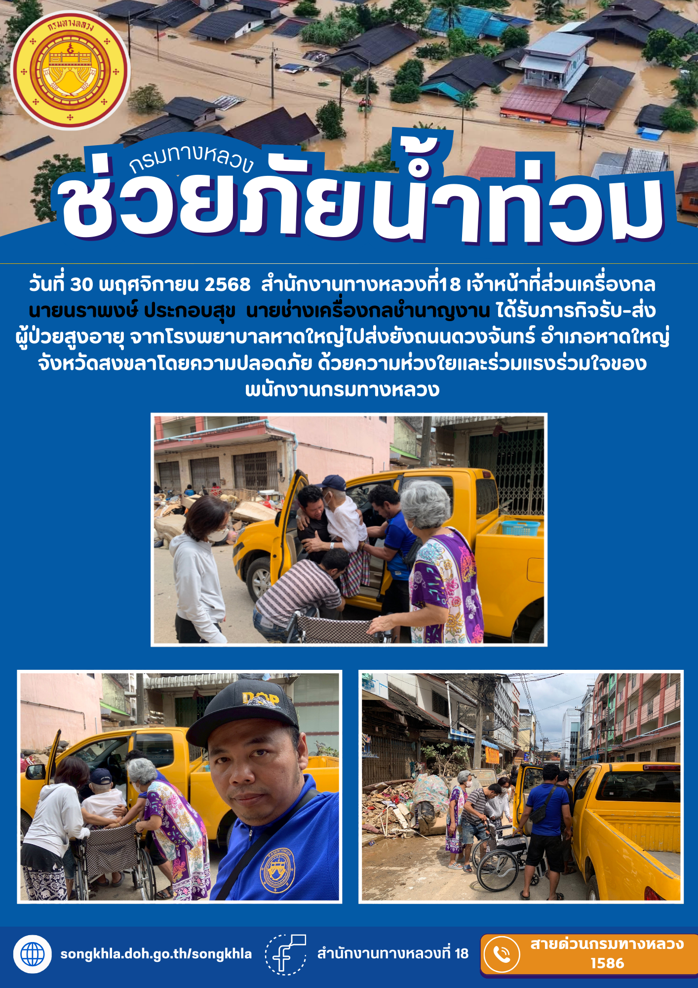 สำนักงานทางหลวงที่ 18 โดยนายสาโรจน์ ขุนจันทร์ ผู้อำนวยการส่วนเครื่องกล ได้รับภารกิจรับถุงยังชีพจากการท่าอากาศยานหาดใหญ่ เพื่อส่งต่อช่วยเหลือผู้ประสบภัยอ.หาดใหญ่ จ.สงขลา