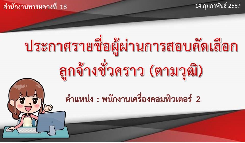 ข้อมูลประกาศรับสมัครพนักงานราชการ : ประกาศรายชื่อผู้ผ่านการสอบคัดเลือกลูกจ้างชั่วคราว (ตามวุฒิ) ตำแหน่ง : พนักงานเครื่องคอมพิวเตอร์ 2