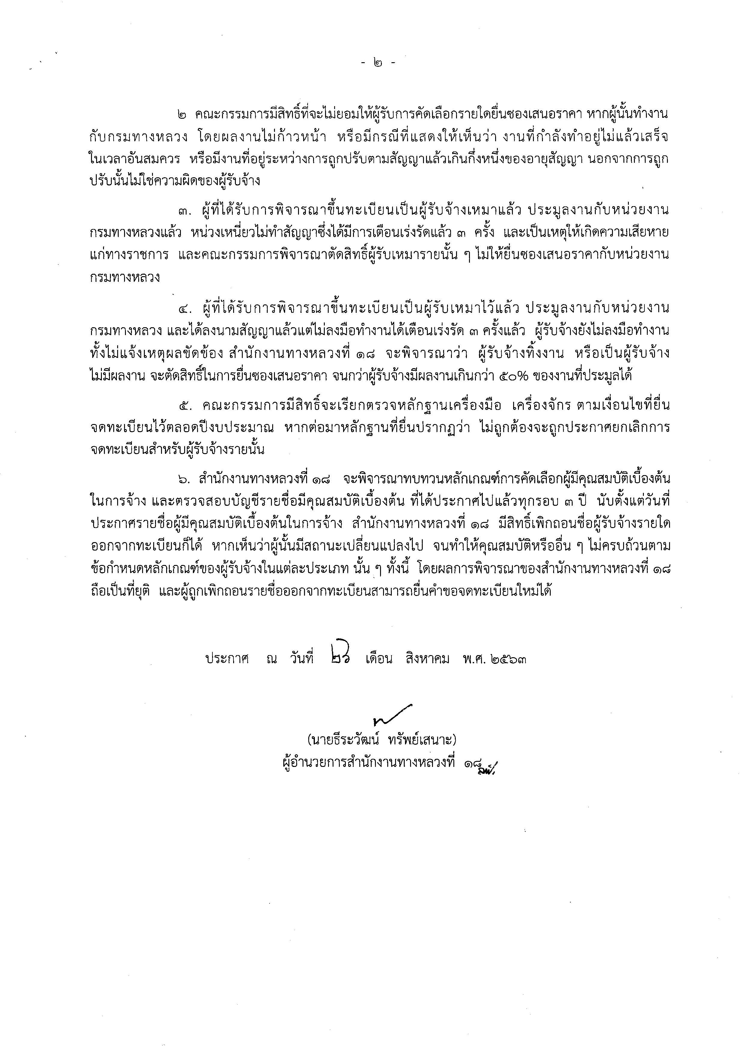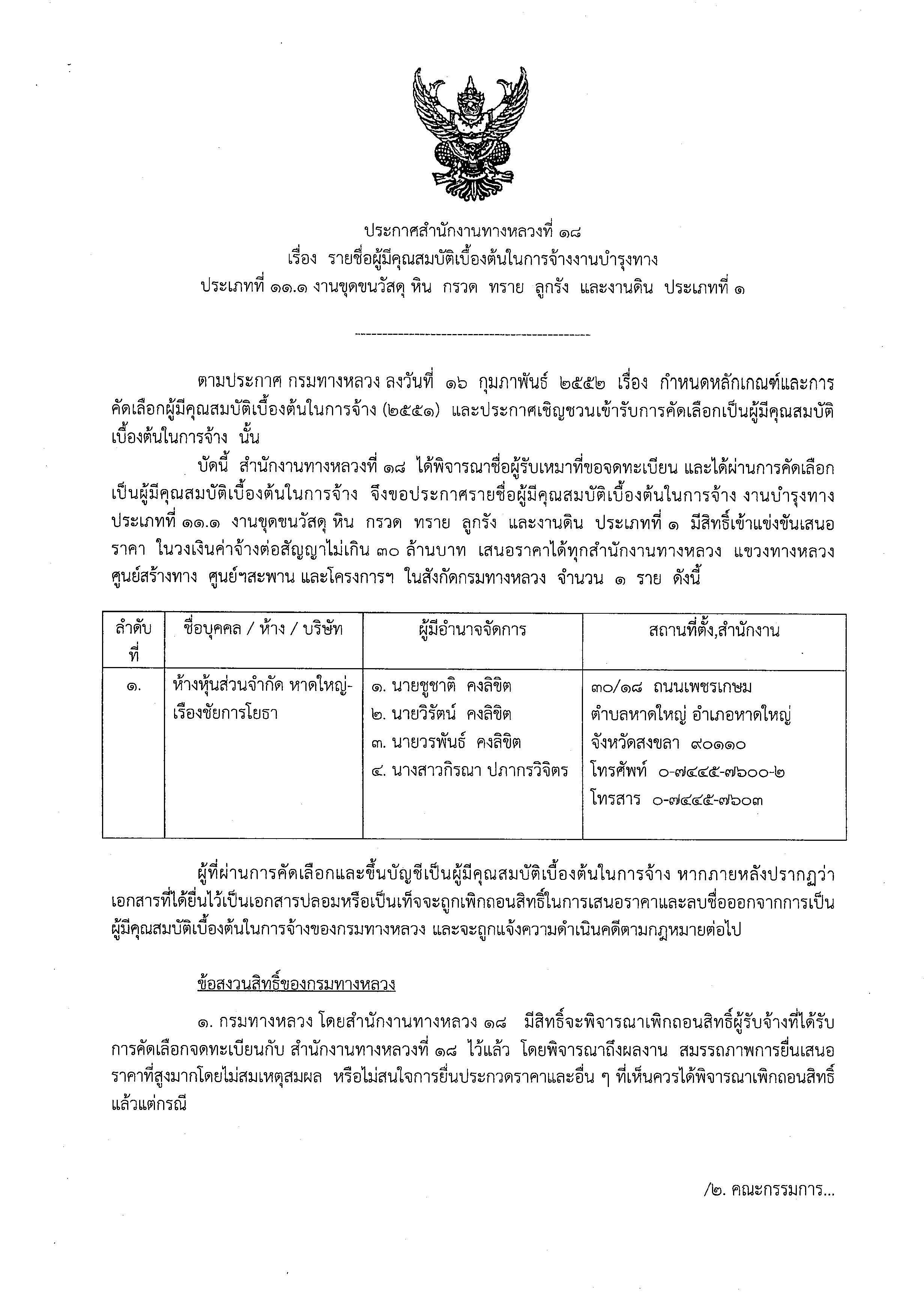 ประกาศรายชื่อผู้มีสิทธิ์รับเหมางานบำรุงทาง ประเภทที่ 11.1 งานขุดขนวัสดุ หิน กรวด ทราย ลูกรัง และงานดิน ประเภทที่ 1