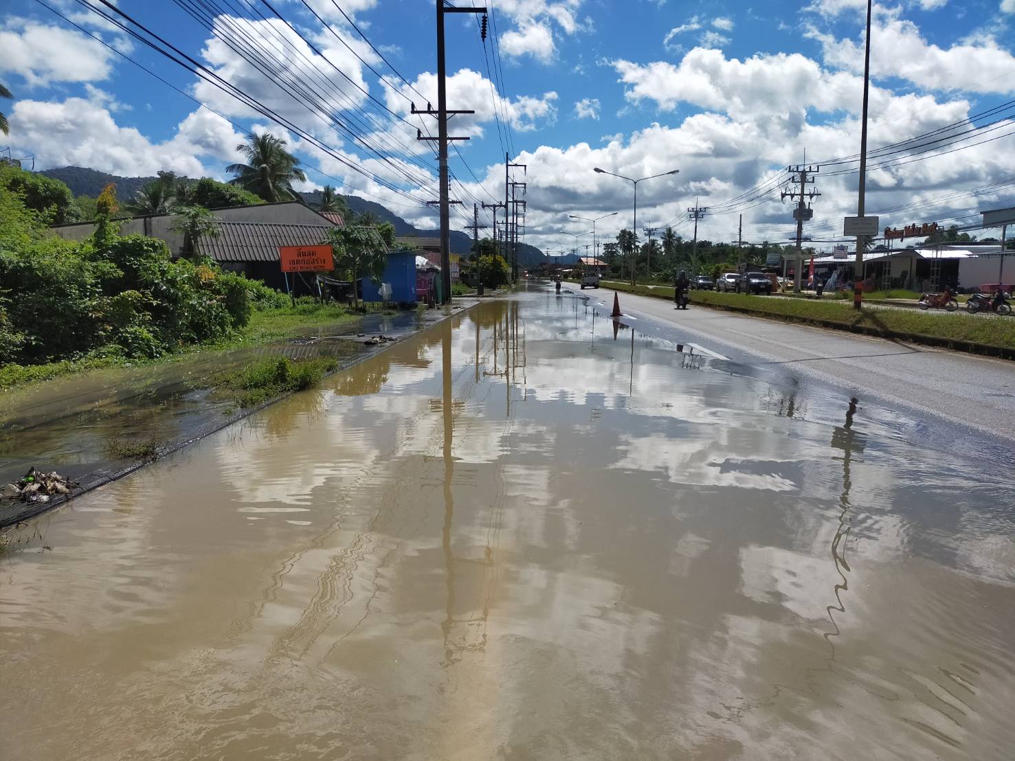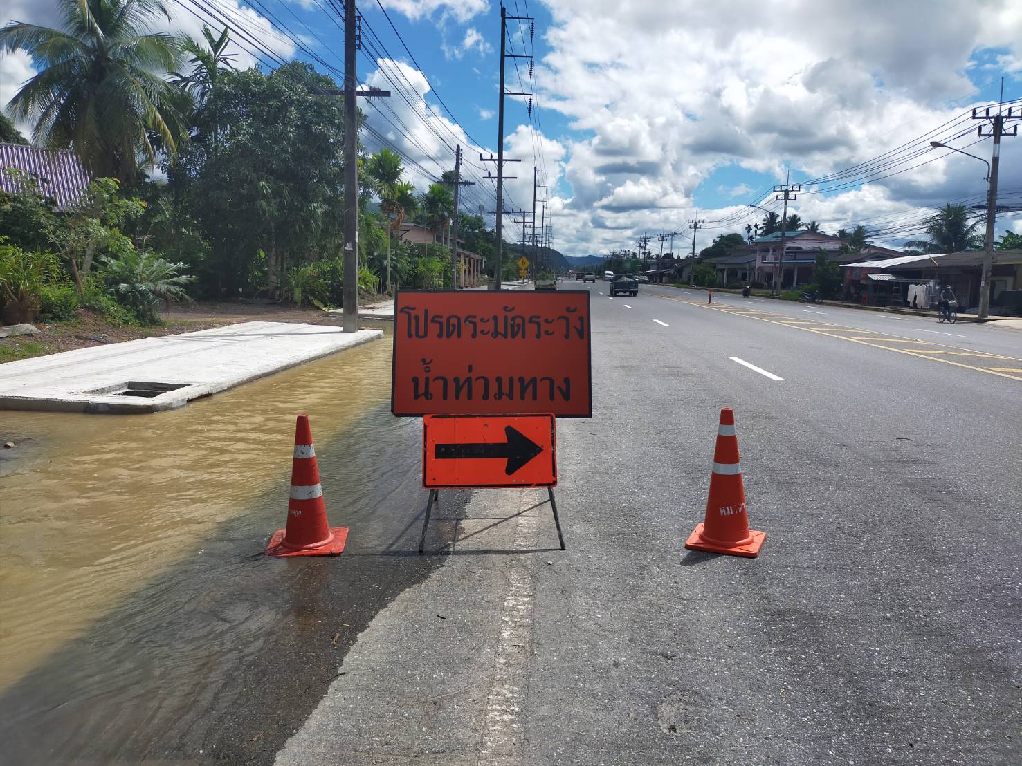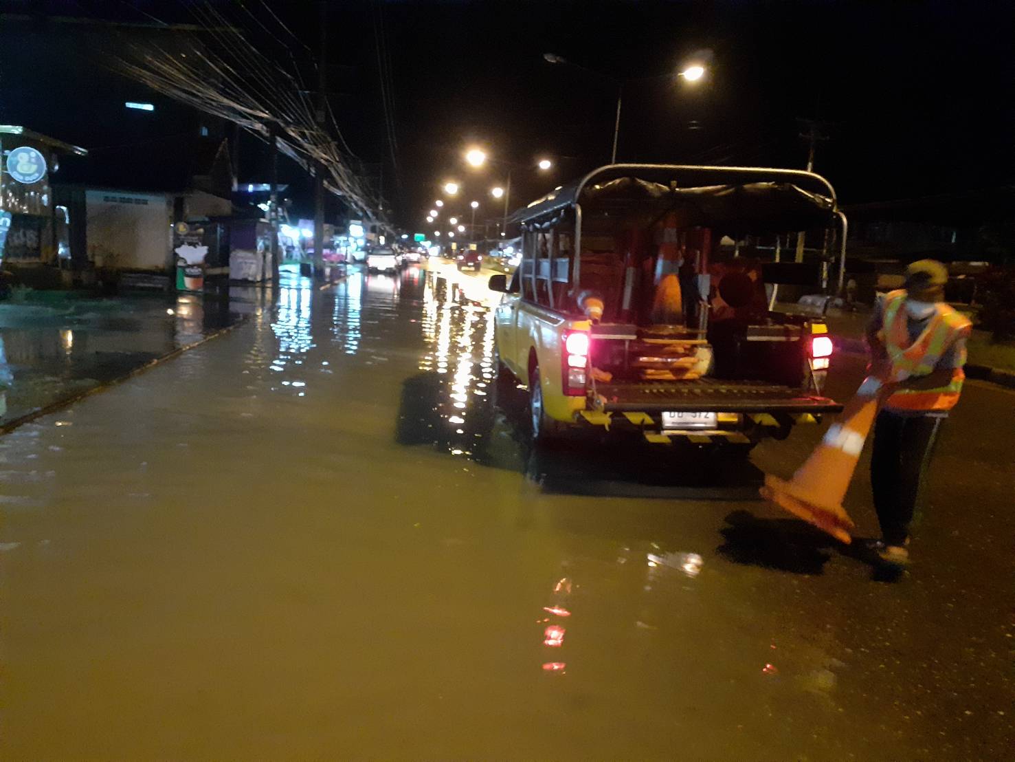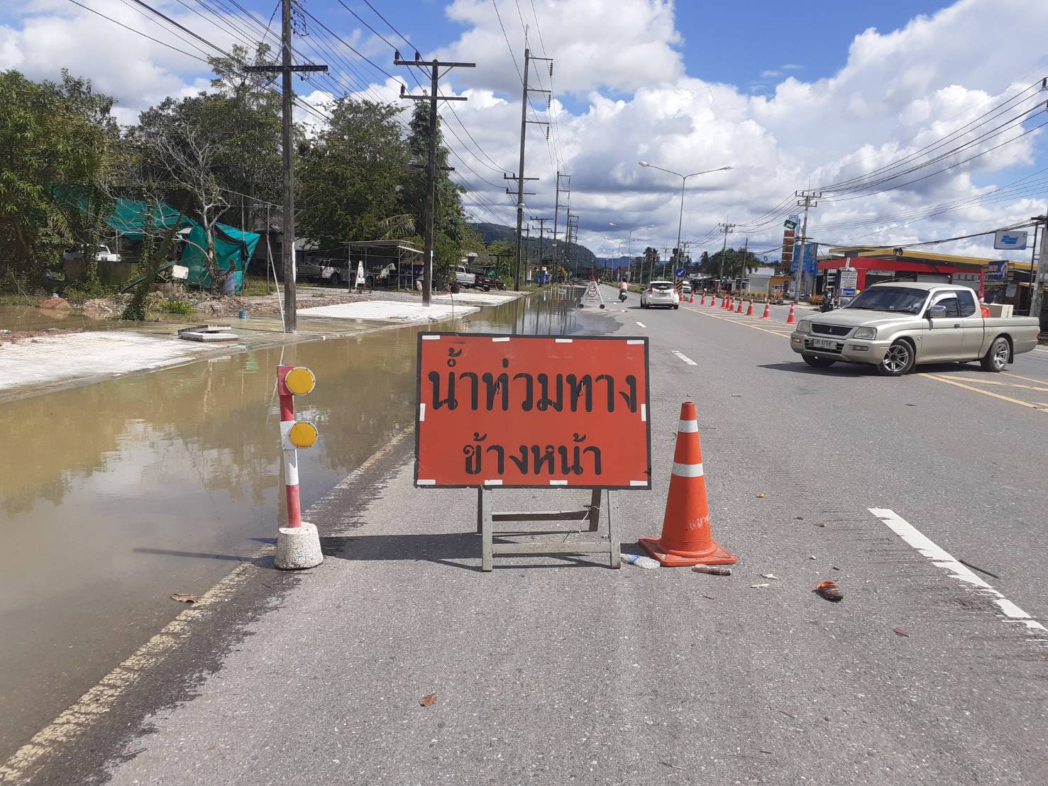 เนื่องจากฝนตกต่อเนื่อง ทำให้น้ำเออล้น ท่วมผิวจราจร ระดับน้ำด้านขวาและด้านซ้ายท่วมสูง 15-20. ซม. ข้างละ 1. ช่องจราจร