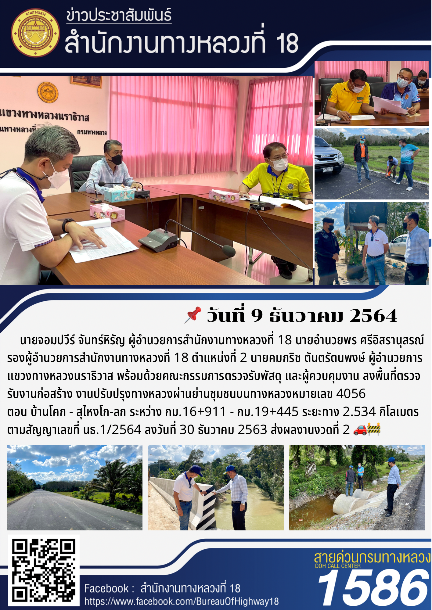 วันนี้ (9 ธันวาคม 2564) นายจอมปวีร์ จันทร์หิรัญ ผู้อำนวยการสำนักงานทางหลวงที่ 18 นายอำนวยพร ศรีอิสรานุสรณ์ รองผู้อำนวยการสำนักงานทางหลวงที่ 18 ตำแหน่งที่ 2 นายคมกริช ตันตรัตนพงษ์ ผู้อำนวยการแขวงทางหลวงนราธิวาส พร้อมด้วยคณะกรรมการตรวจรับพัสดุ และผู้ควบคุมงาน ลงพื้นที่ตรวจรับงานก่อสร้างงานปรับปรุงทางหลวงผ่านย่านชุมชนบนทางหลวงหมายเลข 4056 ตอน บ้านโคก - สุไหงโก-ลก ระหว่างกม.16+911 - กม.19+445 ระยะทางยาวประมาณ 2.534 กิโลเมตร ตามสัญญาเลขที่ นธ.1/2564 ลงวันที่ 30 ธันวาคม 2563 ส่งผลงานงวดที่