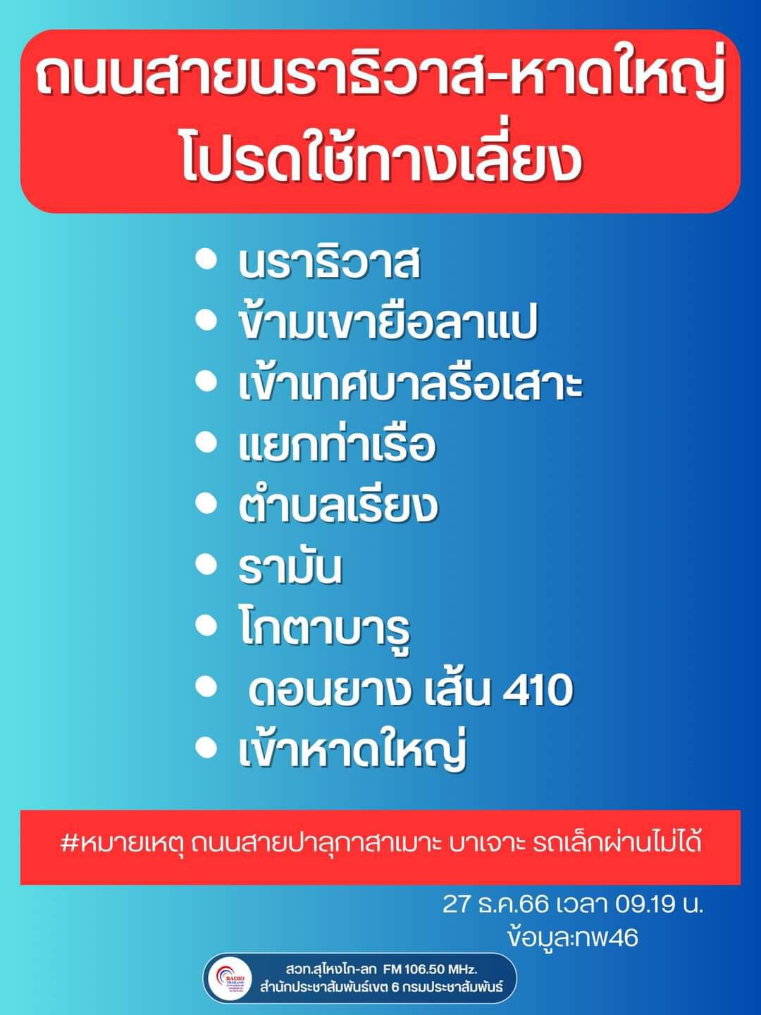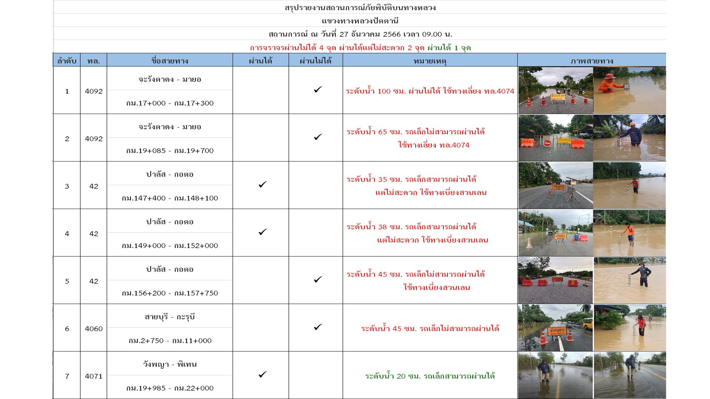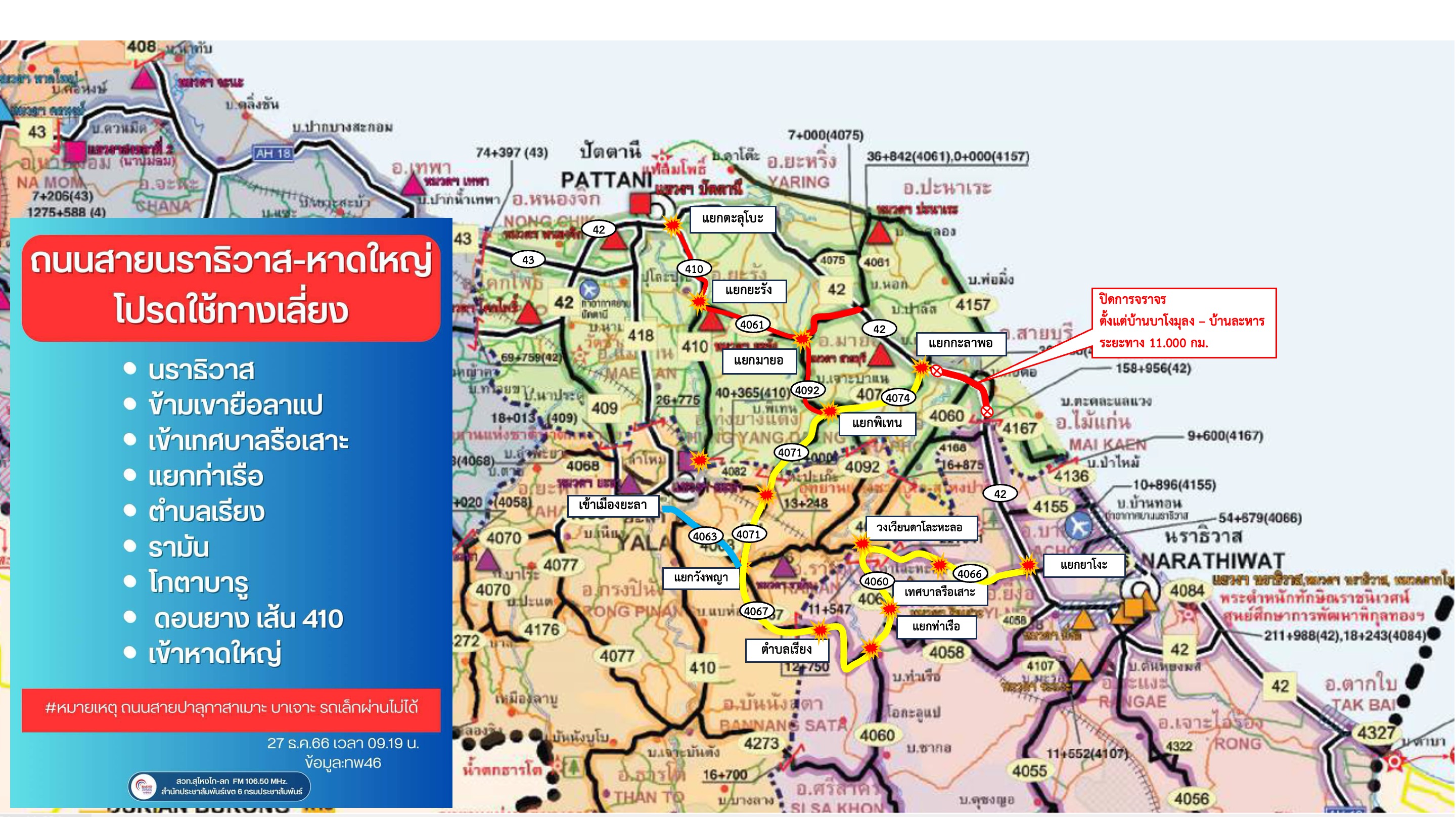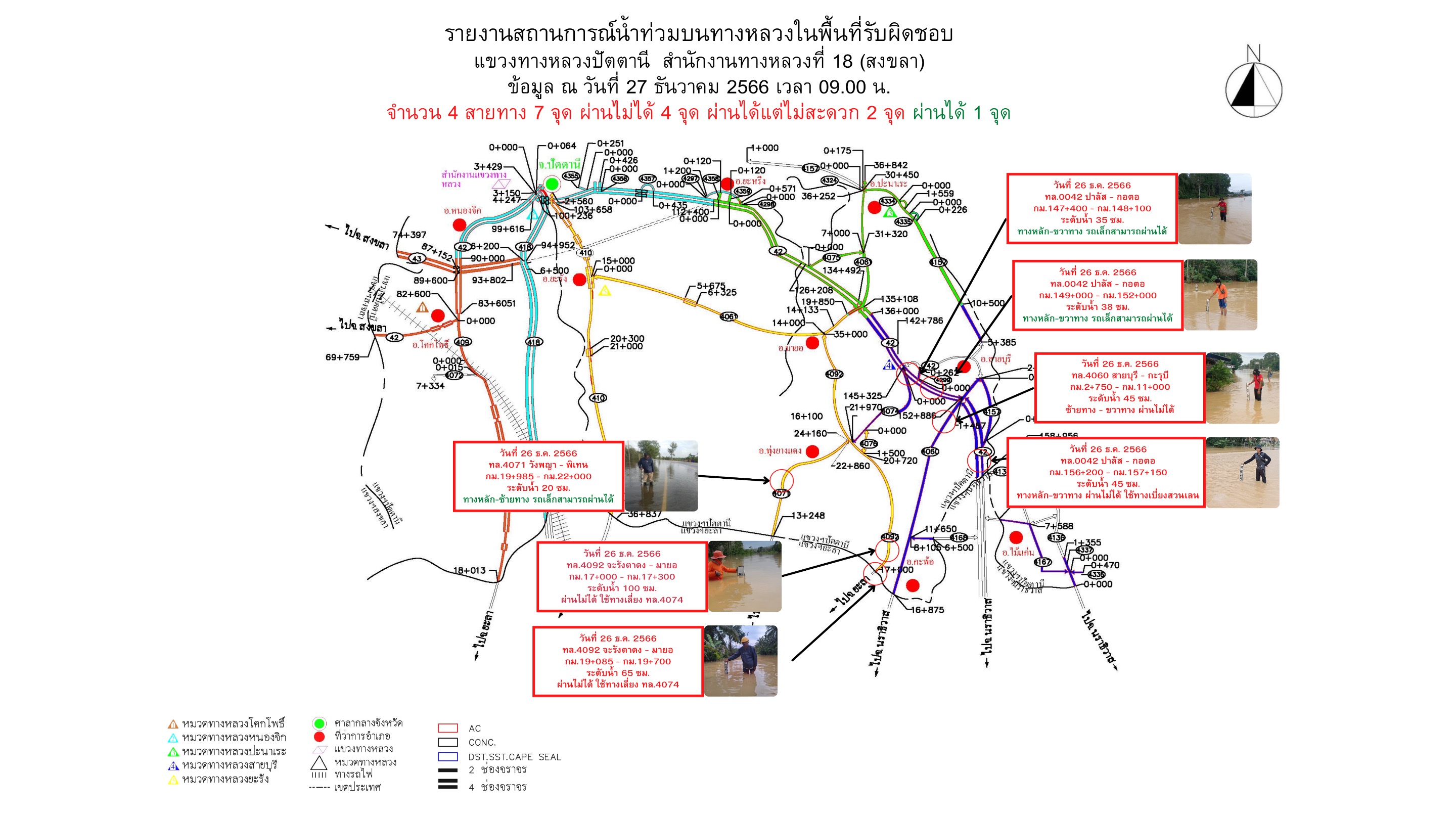 สรุปข้อมูลน้ำท่วม และการปิดการจราจร เส้นทางในความควบคุม เส้นทางเลี่ยง จาก จ.นราธิวาส – จ.ปัตตานี – จ.ยะลา – จ.สงขลา