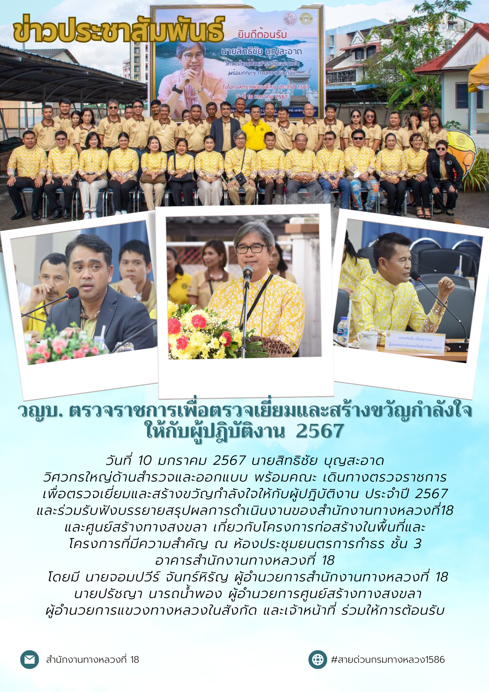 วันที่ 10 มกราคม 2567 เวลา 09.30 น. นายสิทธิชัย บุญสะอาด วิศวกรใหญ่ด้านสำรวจและออกแบบ พร้อมคณะ เดินทางตรวจราชการเพื่อตรวจเยี่ยมและสร้างขวัญกำลังใจให้กับผู้ปฎิบัติงาน ประจำปี 2567 และร่วมรับฟังบรรยายสรุปผลการดำเนินงานของสำนักงานทางหลวงที่ 18 และศูนย์สร้างทางสงขลา เกี่ยวกับโครงการก่อสร้างในพื้นที่และโครงการที่มีความสำคัญ ณ ห้องประชุมยนตรการกำธร ชั้น 3 อาคารสำนักงานทางหลวงที่ 18 โดยมี นายจอมปวีร์ จันทร์หิรัญ ผู้อำนวยการสำนักงานทางหลวงที่ 18 นายปรัชญา นารถน้ำพอง ผู้อำนวยการศูนย์สร้างทางสงขลา ผู้อำนวยการแขวงทางหลวงในสังกัด และเจ้าหน้าที่ ร่วมให้การต้อนรับ