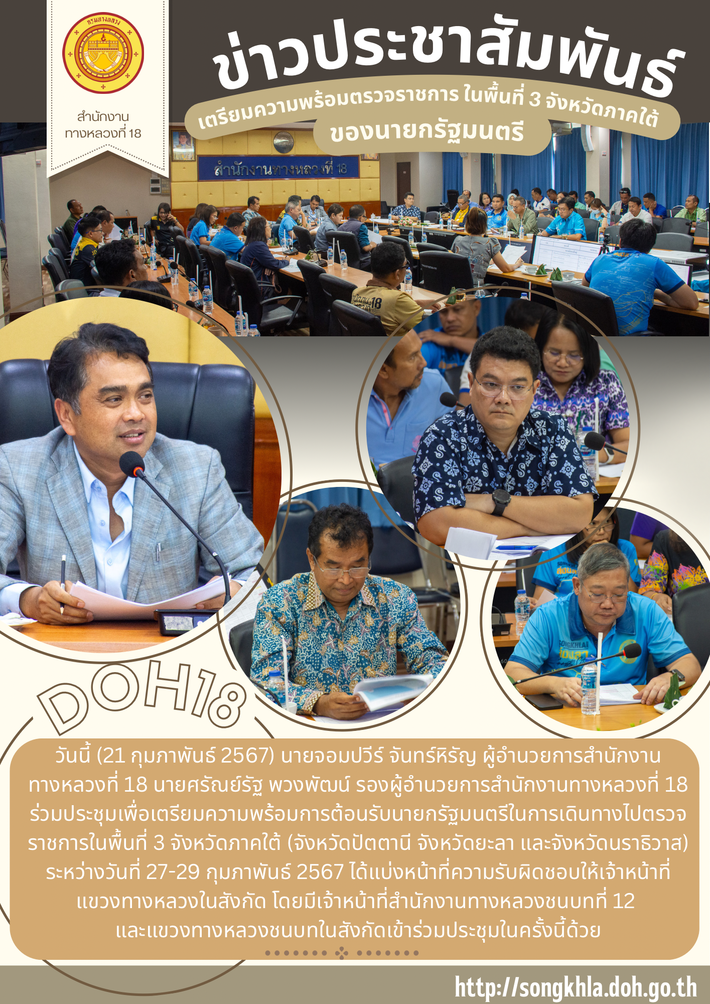 วันนี้ (21 กุมภาพันธ์ 2567) นายจอมปวีร์ จันทร์หิรัญ ผู้อำนวยการสำนักงานทางหลวงที่ 18 นายศรัณย์รัฐ พวงพัฒน์ รองผู้อำนวยการสำนักงานทางหลวงที่ 18 ร่วมประชุมเพื่อเตรียมความพร้อมการต้อนรับนายกรัฐมนตรีในการเดินทางไปตรวจราชการในพื้นที่ 3 จังหวัดภาคใต้ (จังหวัดปัตตานี จังหวัดยะลา และจังหวัดนราธิวาส) ระหว่างวันที่ 27-29 กุมภาพันธ์ 2567