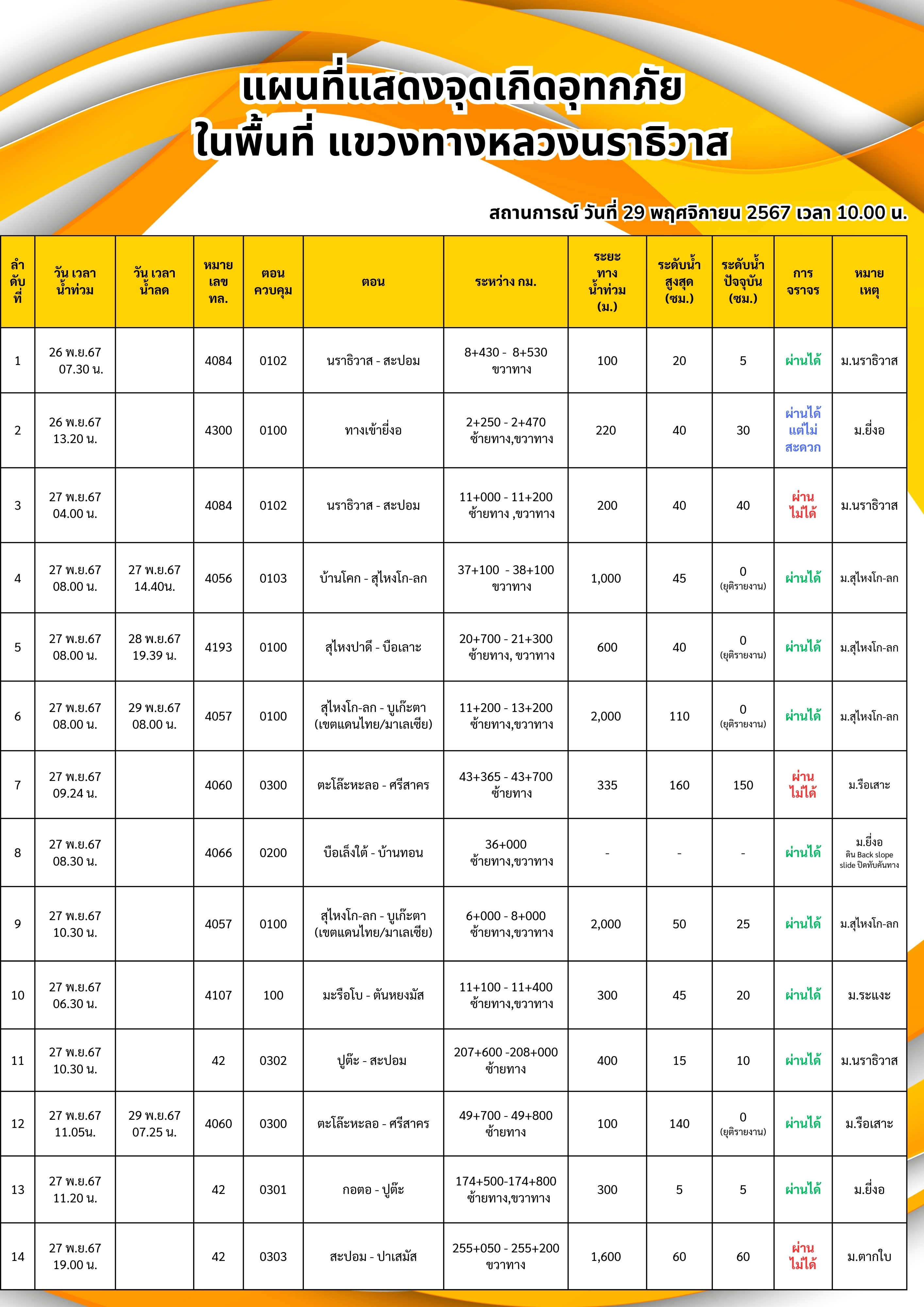 ข้อมูลข่าว : แผนที่แสดงจุดเกิดอุทกภัยภาพรวมแขวงทางหลวงนราธิวาส ข้อมูล ณ วันที่ 29-11-67 เวลา 10.00 น.