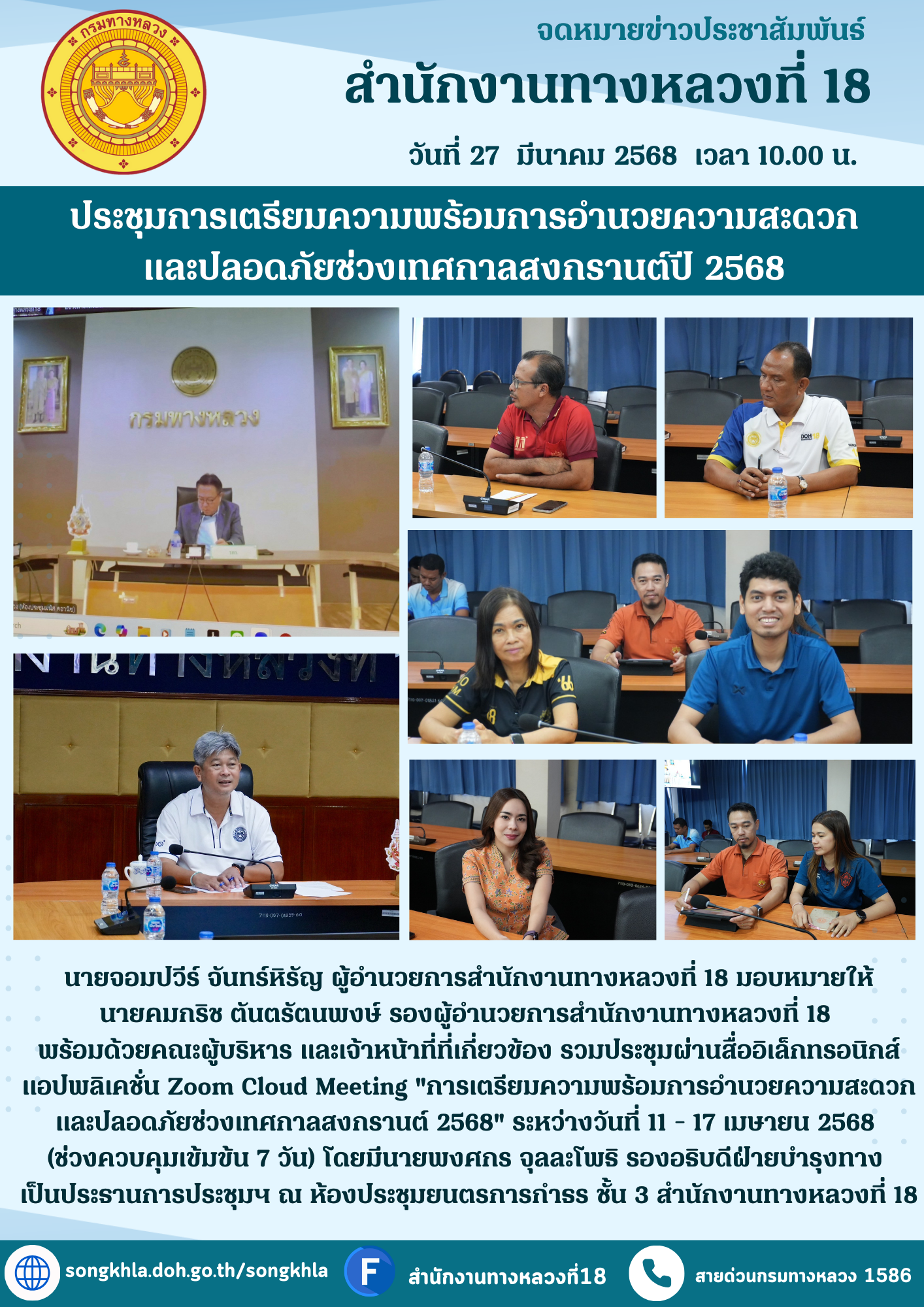 วันที่ 27 มีนาคม 2568 เวลา 10.00 น. นายจอมปวีร์ จันทร์หิรัญ ผู้อำนวยการสำนักงานทางหลวงที่ 18 มอบหมายให้นายคมกริช ตันตรัตนพงษ์ รองผู้อำนวยการสำนักงานทางหลวงที่ 18 พร้อมด้วยคณะผู้บริหาร และเจ้าหน้าที่ที่เกี่ยวข้อง รวมประชุมผ่านสื่ออิเล็กทรอนิกส์ แอปพลิเคชั่น Zoom Cloud Meeting "การเตรียมความพร้อมการอำนวยความสะดวกและปลอดภัยช่วงเทศกาลสงกรานต์ 2568" ระหว่างวันที่ 11 - 17 เมษายน 2568 (ช่วงควบคุมเข้มข้น 7 วัน) โดยมีนายพงศกร จุลละโพธิ รองอธิบดีฝ่ายบำรุงทาง เป็นประธานการประชุมฯ ณ ห้องประชุมยนตรการกำธร ชั้น 3 สำนักงานทางหลวงที่ 18