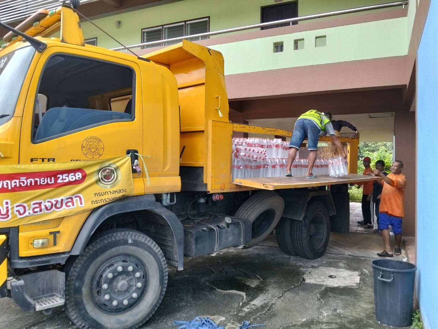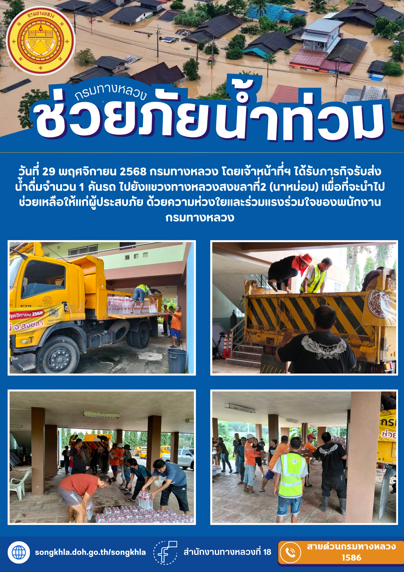 กรมทางหลวง โดยเจ้าหน้าที่ฯ ได้รับภารกิจรับส่งน้ำดื่มไปยังแขวงทางหลวงสงขลาที่2 (นาหม่อม) เพื่อที่จะนำไปช่วยเหลือให้แก่ผู้ประสบภัย