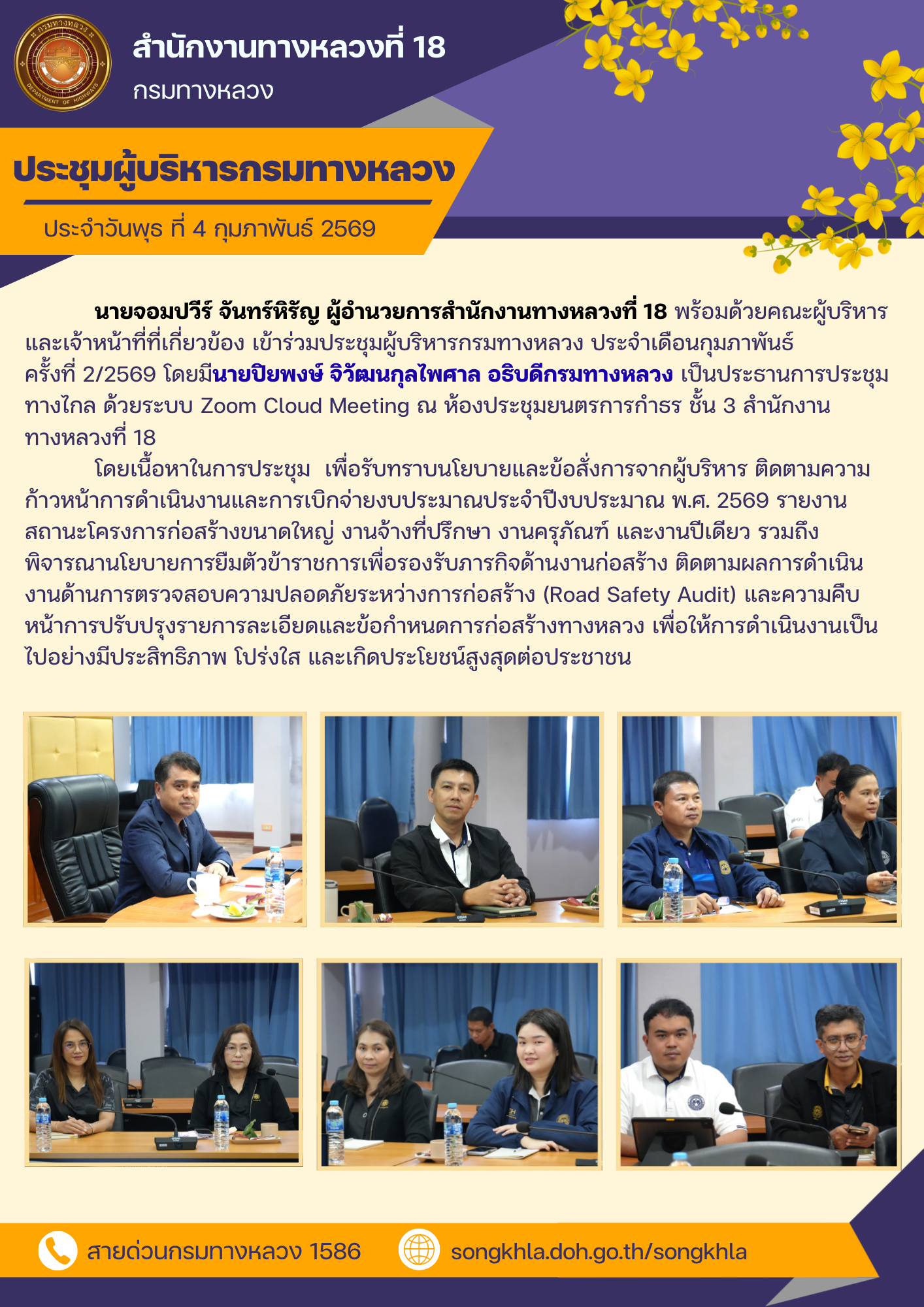 วันที่ 4 กุมภาพันธ์ 2569 เวลา 10.00 น. นายจอมปวีร์ จันทร์หิรัญ ผู้อำนวยการสำนักงานทางหลวงที่ 18 พร้อมด้วยคณะผู้บริหารและเจ้าหน้าที่ที่เกี่ยวข้อง เข้าร่วมประชุมผู้บริหารกรมทางหลวง ประจำเดือนกุมภาพันธ์ ครั้งที่ 2/2569 โดยมีนายปิยพงษ์ จิวัฒนกุลไพศาล อธิบดีกรมทางหลวง เป็นประธานการประชุมทางไกล ด้วยระบบ Zoom Cloud Meeting ณ ห้องประชุมยนตรการกำธร ชั้น 3 สำนักงานทางหลวงที่ 18