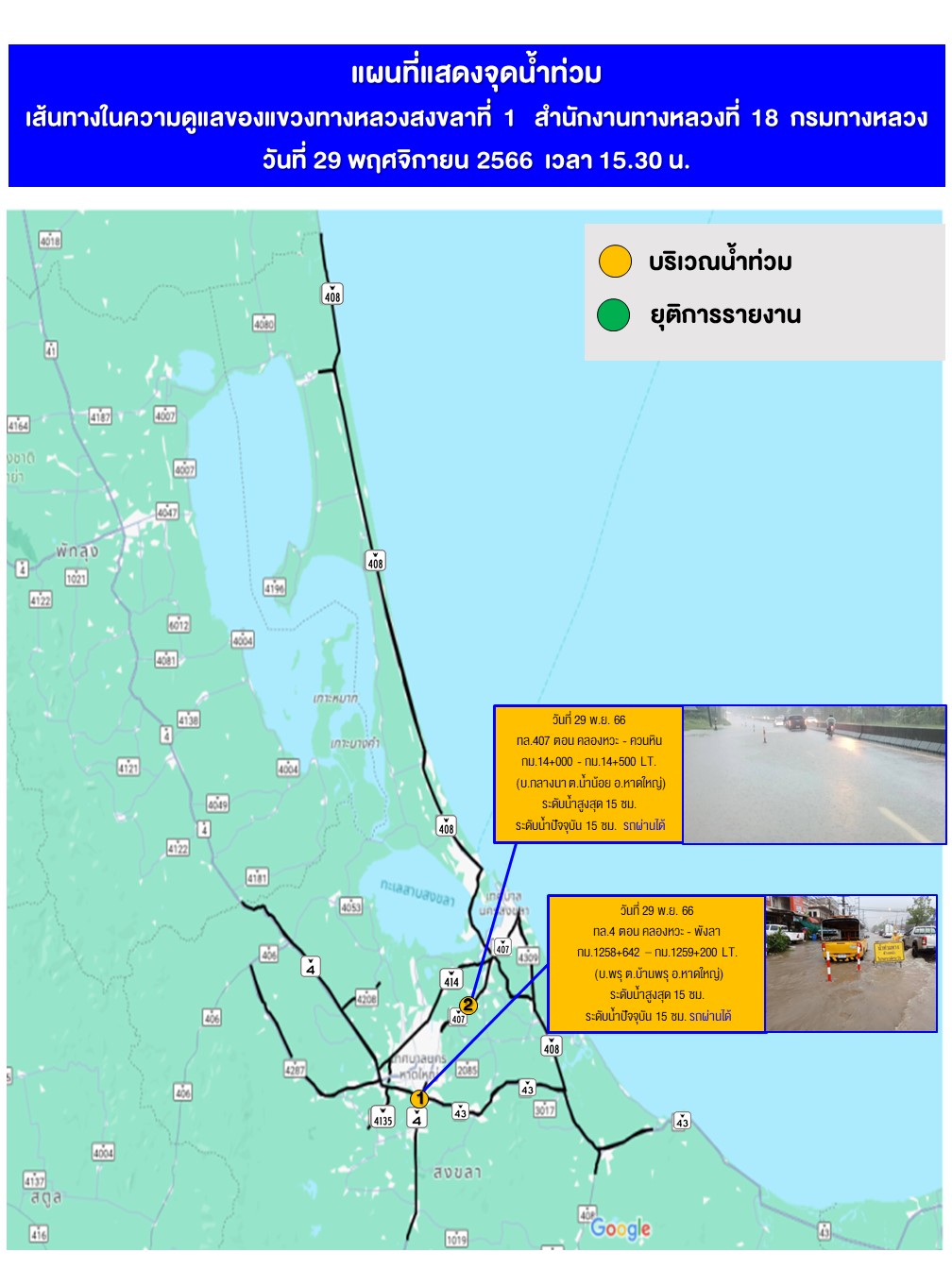 สถานการณ์น้ำท่วมในพื้นที่สายทางความรับผิดชอบของแขวงทางหลวงสงขลาที่ 1