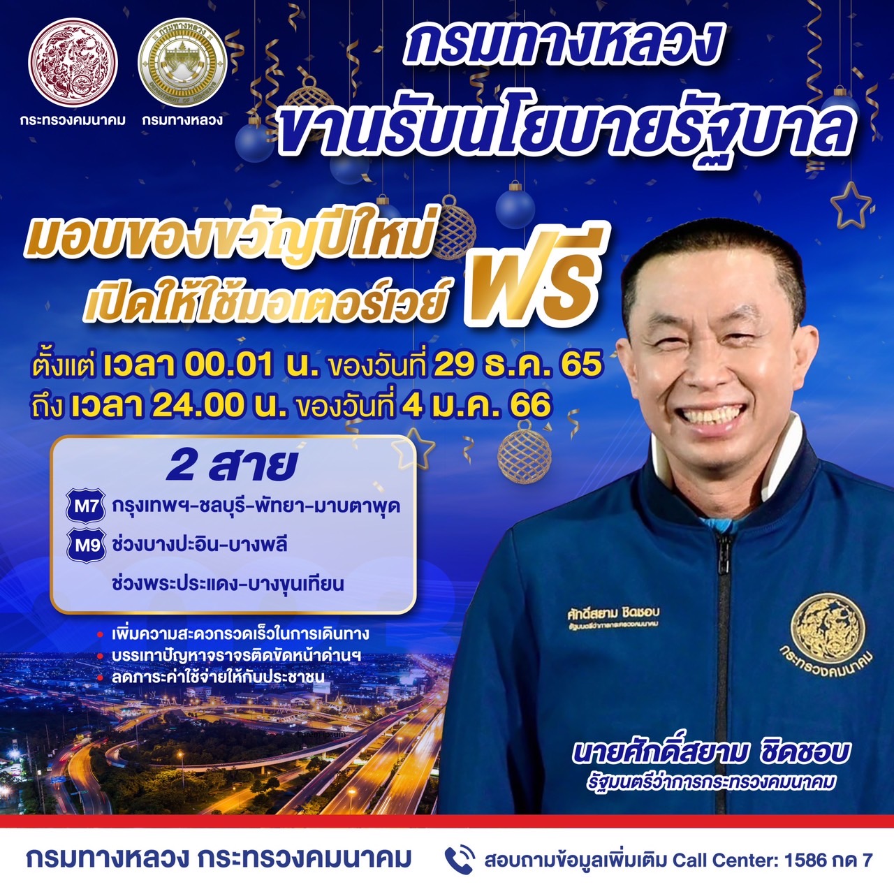 อธิบดีกรมทางหลวง กล่าวต่อไปว่า กรมทางหลวงได้ยกเว้นค่าธรรมเนียมผ่านทางบนทางหลวงพิเศษหมายเลข 7 กรุงเทพ – ชลบุรี – พัทยา – มาบตาพุด ทางหลวงพิเศษหมายเลข 9 บางปะอิน – บางพลี และทางหลวงพิเศษหมายเลข 9 พระประแดง – ต่างระดับบางขุนเทียน ตั้งแต่เวลา 00.01 น. ของวันที่ 29 ธันวาคม 2565 ถึง เวลา 24.00 น. ของวันที่ 4 มกราคม 2566 รวมระยะเวลา 7 วัน นอกจากนี้ จะเปิดให้บริการวิ่งฟรีชั่วคราวบนทางหลวงพิเศษหมายเลข 6 ช่วง อ.ปากช่อง – อ.สีคิ้ว – อ.ขามทะเลสอ ระยะทาง 64.26 กิโลเมตร ตั้งแต่วันที่ 29 ธ.ค. 65 – 4 ม.ค. 66 (โดยจัดการจราจรแบบเดินรถทางเดียว วันที่ 29 – 31 ธ.ค. 65 เดินทางขาออก และวันที่ 1 – 4 ม.ค. 66 เดินทางขาเข้า) เพื่อเพิ่มประสิทธิภาพในการเดินทางสู่ภาคตะวันออกเฉียงเหนือ ซึ่งคาดว่าจะมีปริมาณจราจรบนทางหลวงสายหลักและมอเตอร์เวย์ทั้งสิ้น 7,325,097 คัน แบ่งเป็นฝั่งขาออก 3,584,353 คัน และฝั่งขาเข้า 3,740,744 คัน โดยผู้ใช้ทางสามารถติดตามการรายงานสภาพจริงการจราจร Online แบบ Real time ผ่านแอพพลิเคชั่น M-Traffic (มอเตอร์เวย์) / Thailand Highway Traffic และเฟสบุ๊ค “ศูนย์บริหารจัดการจราจรและอุบัติเหตุกรมทางหลวง”